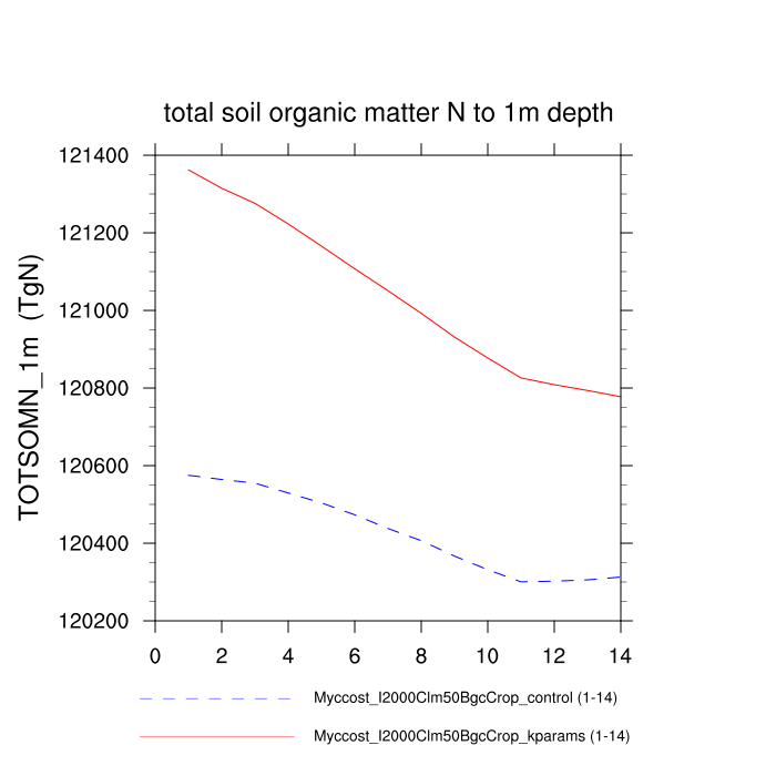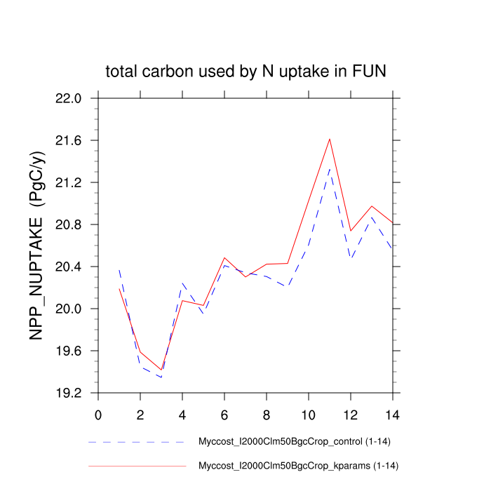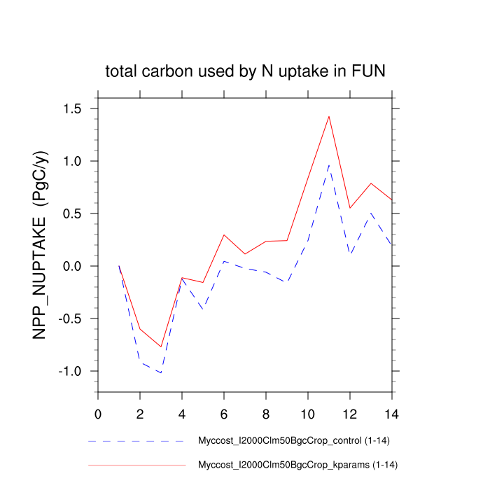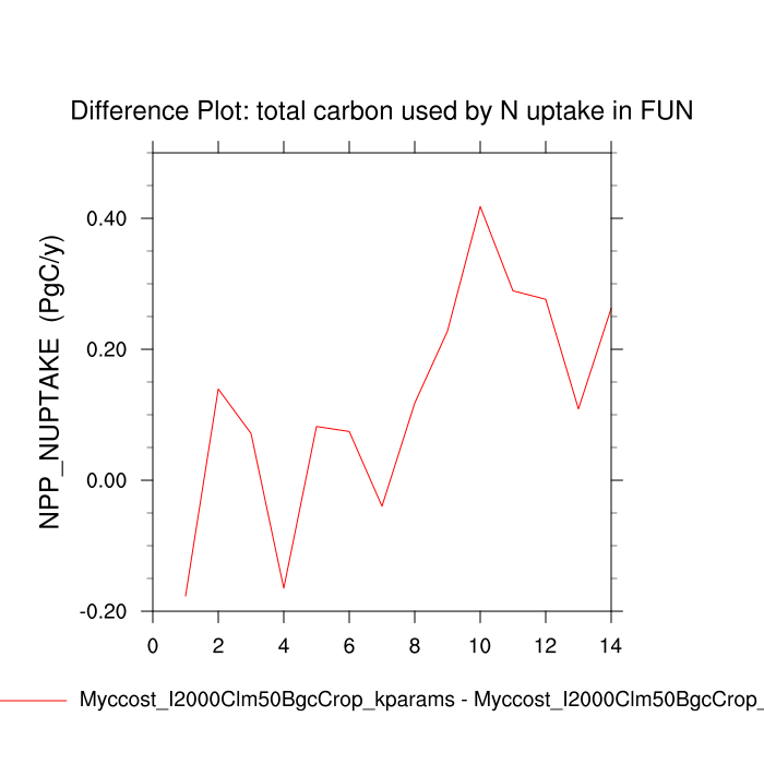| total carbon used by N uptake in FUN (NPP_NUPTAKE) | TrendPlot | DifferencePlot | AnomalyPlot | ||