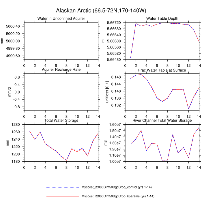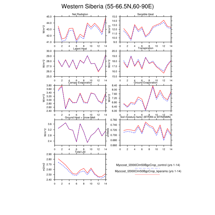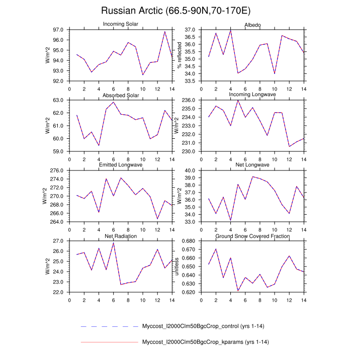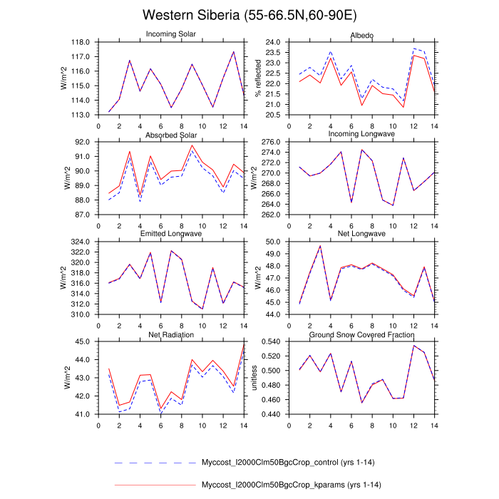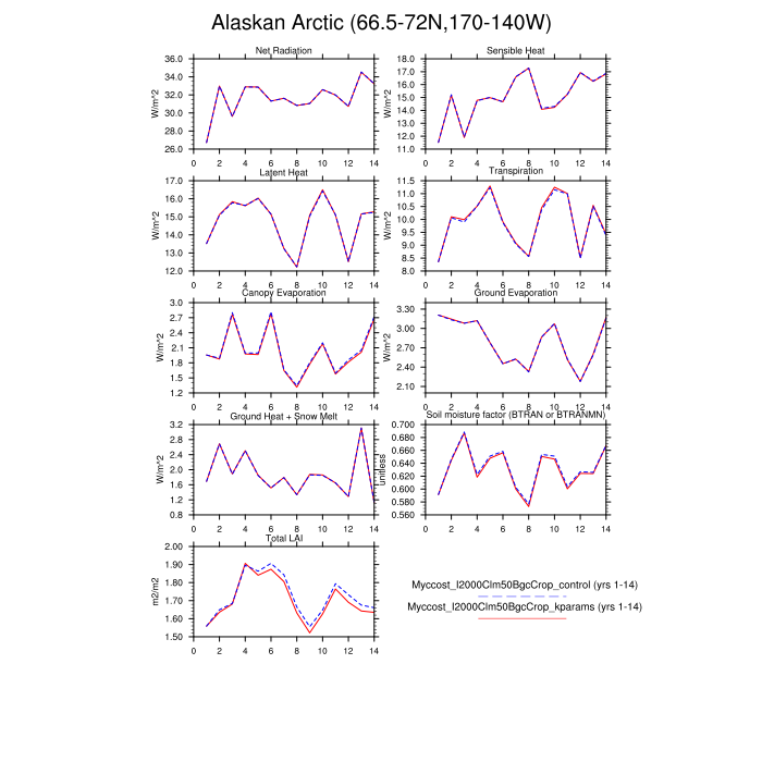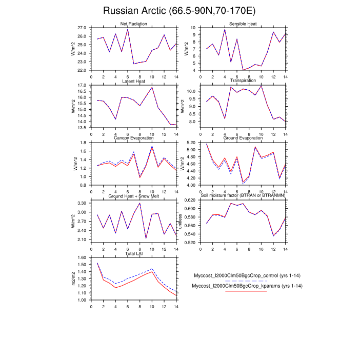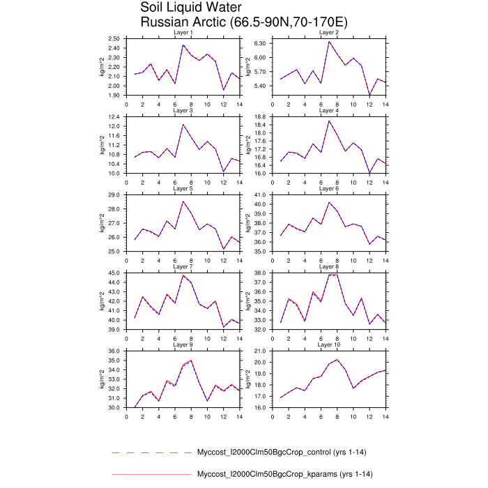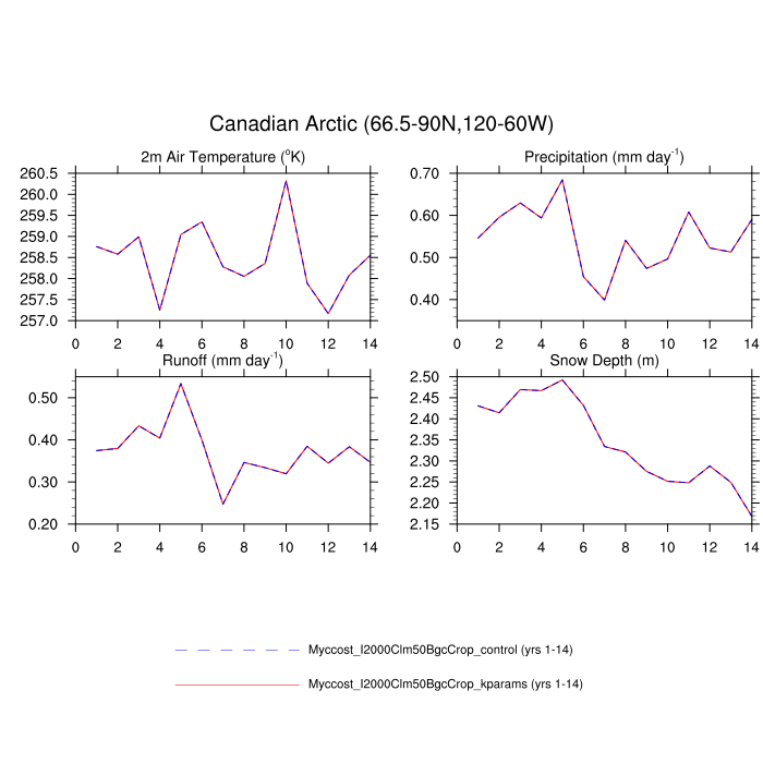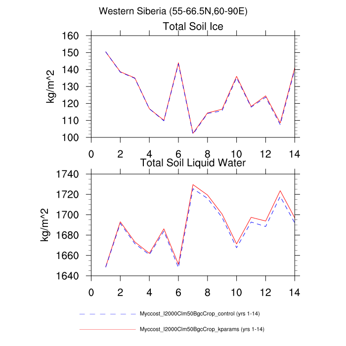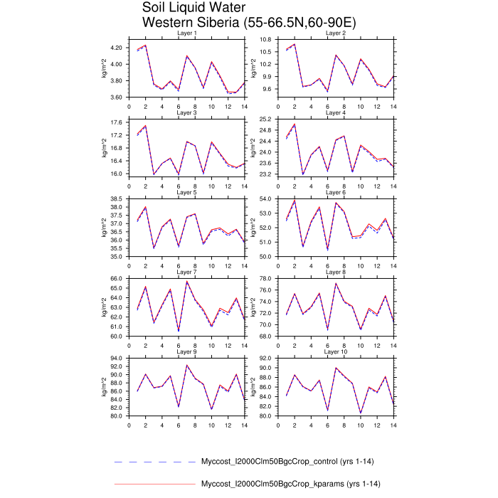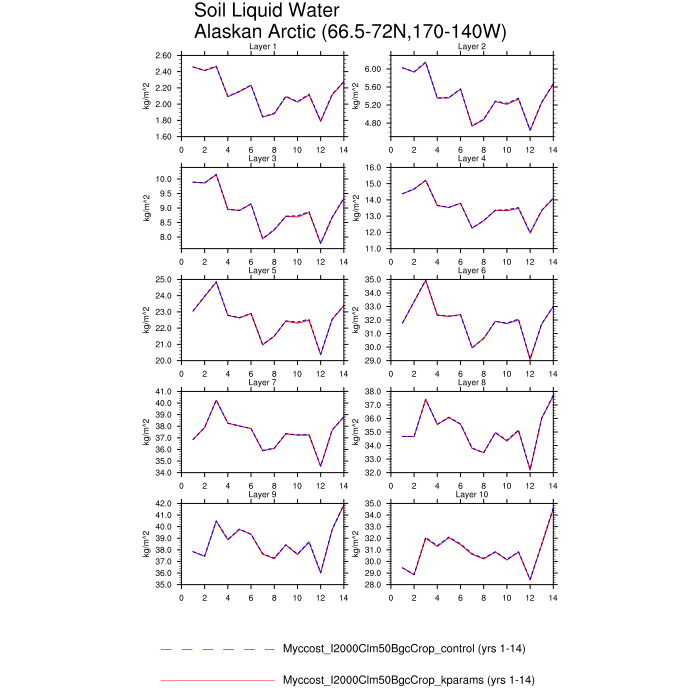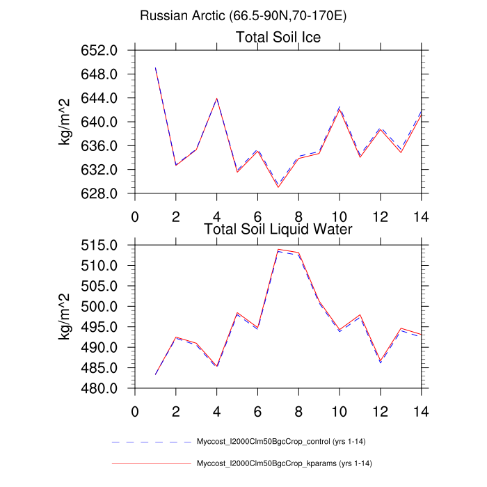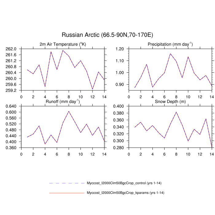 Set 6 Description: Line plots of annual trends in regional soil water/ice and temperature, runoff, snow water/ice, photosynthesis