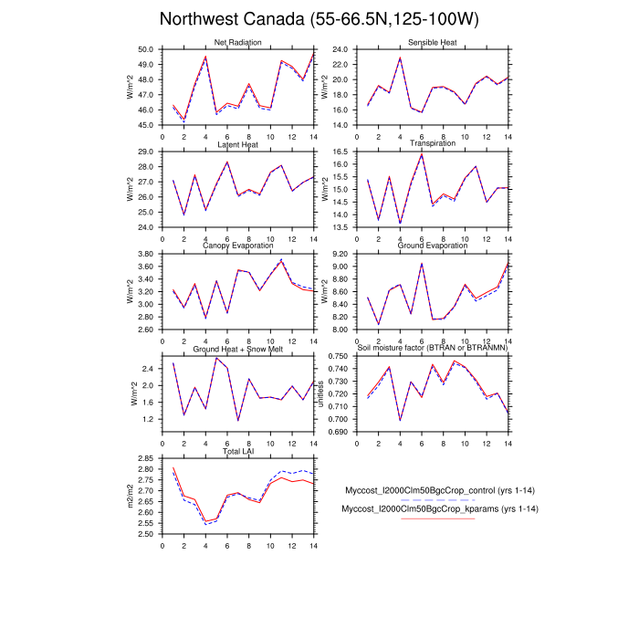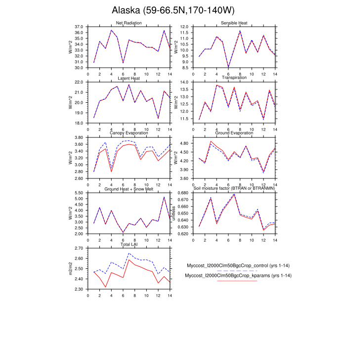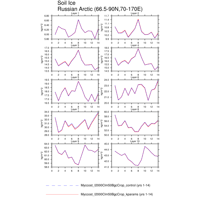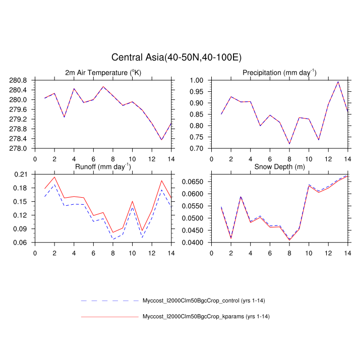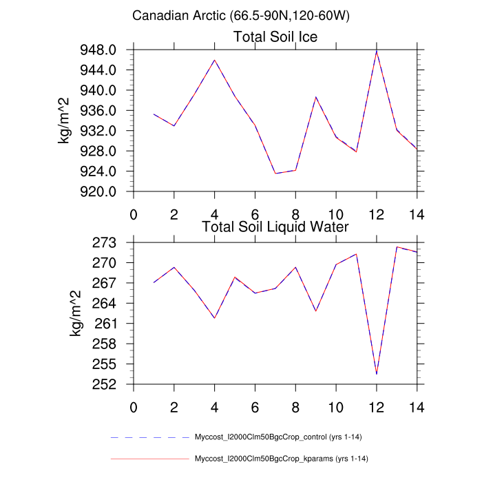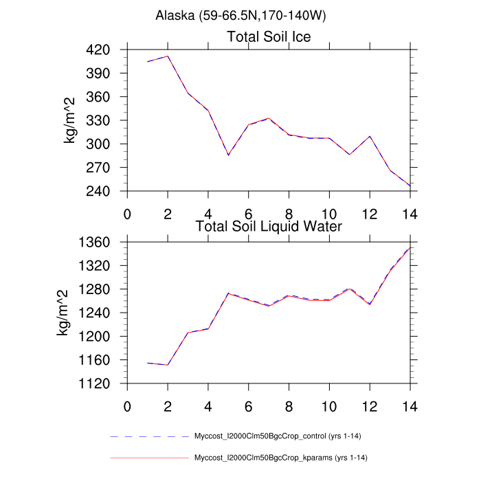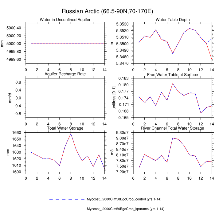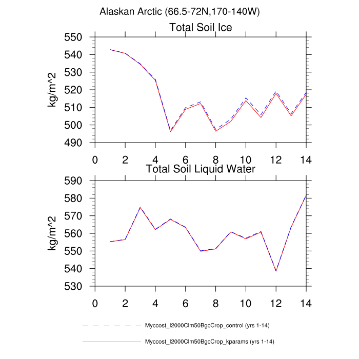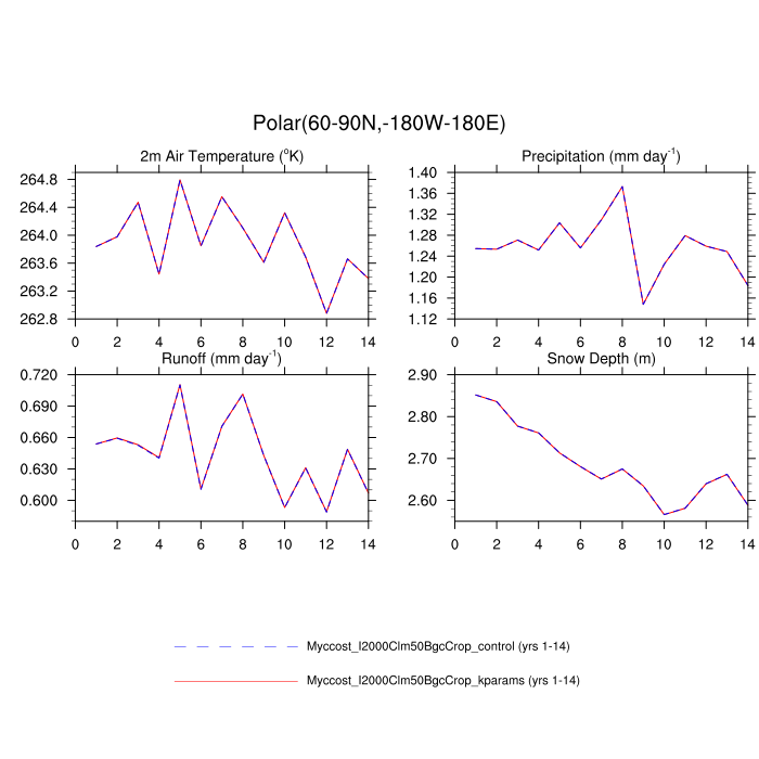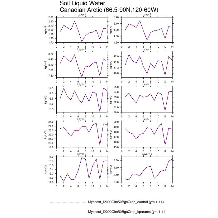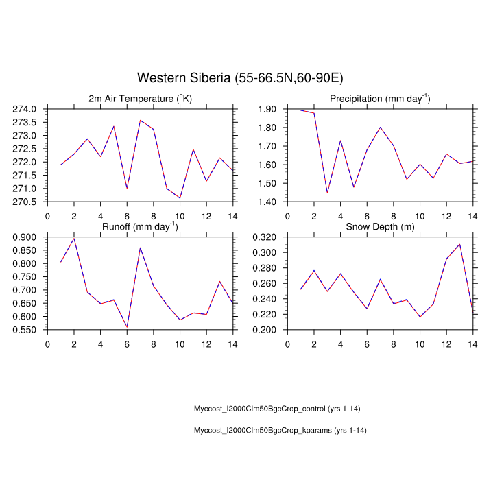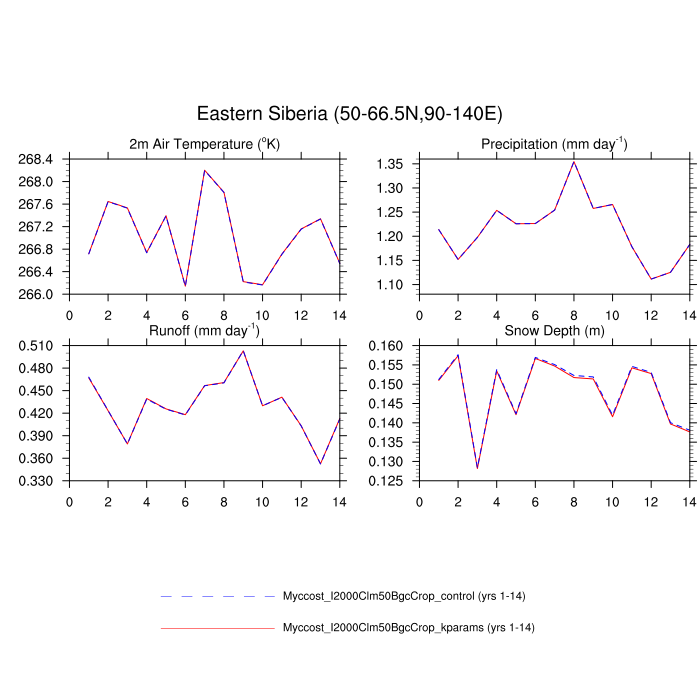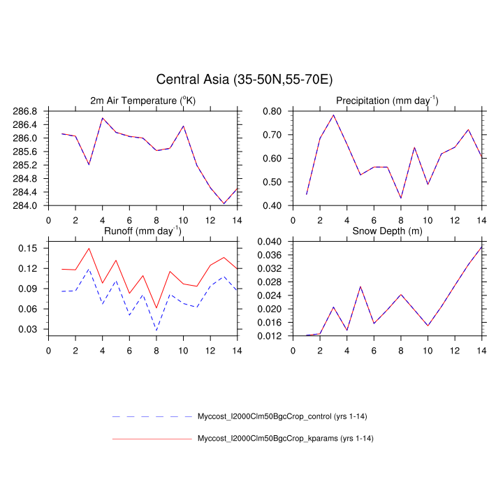 Set 6 Description: Line plots of annual trends in regional soil water/ice and temperature, runoff, snow water/ice, photosynthesis