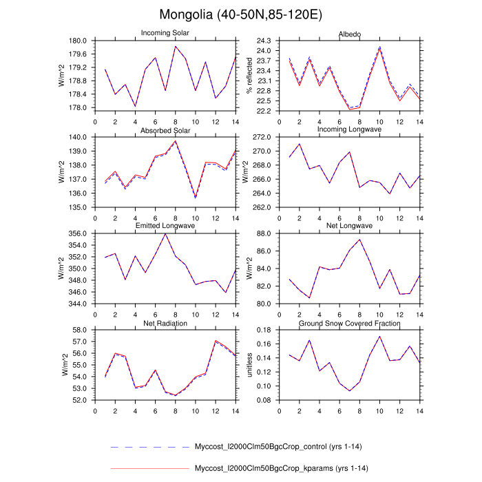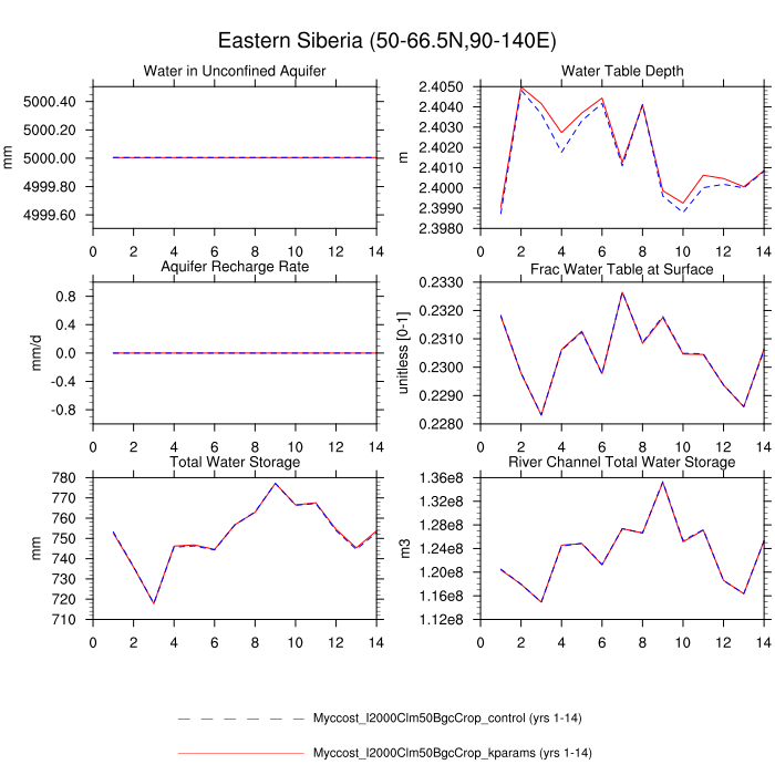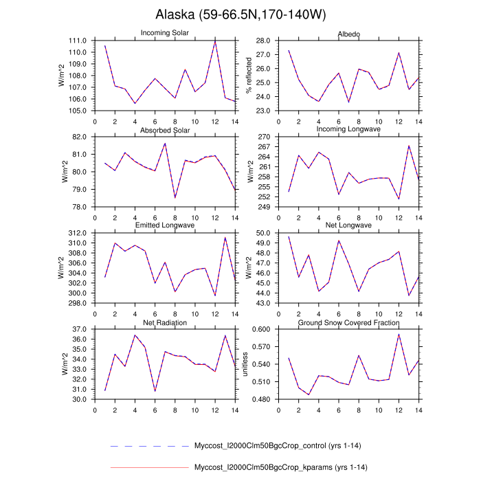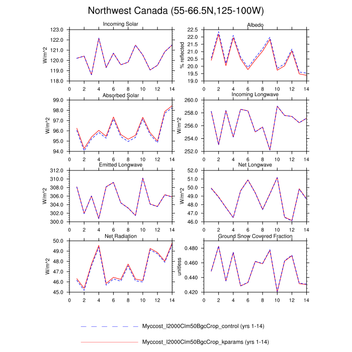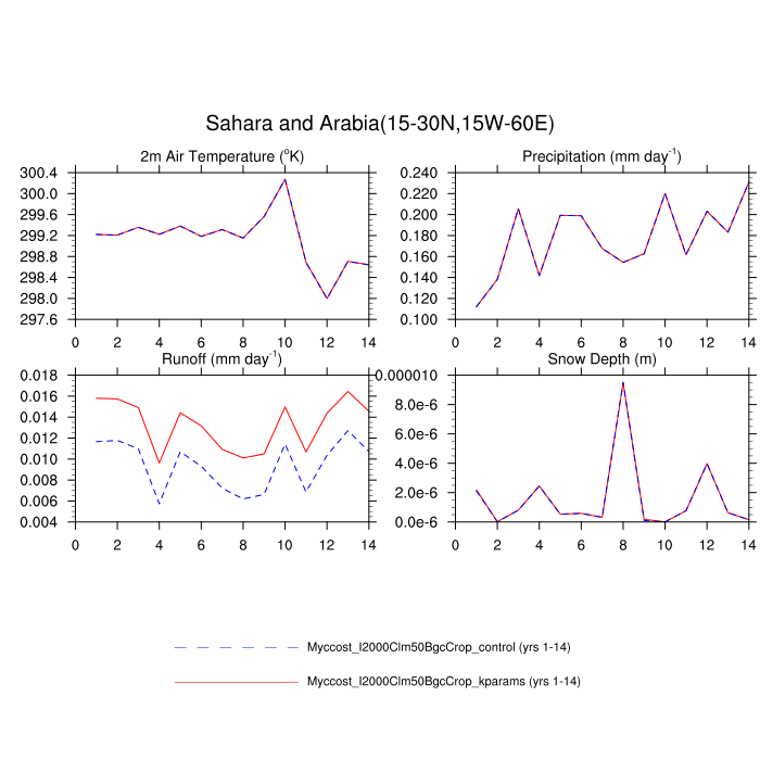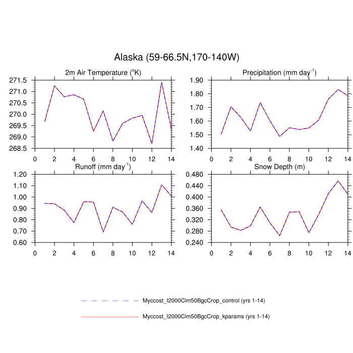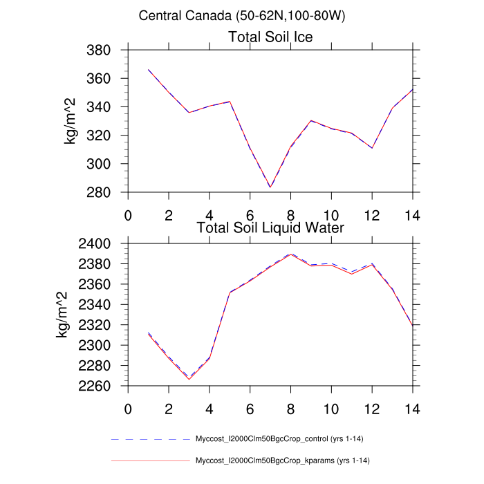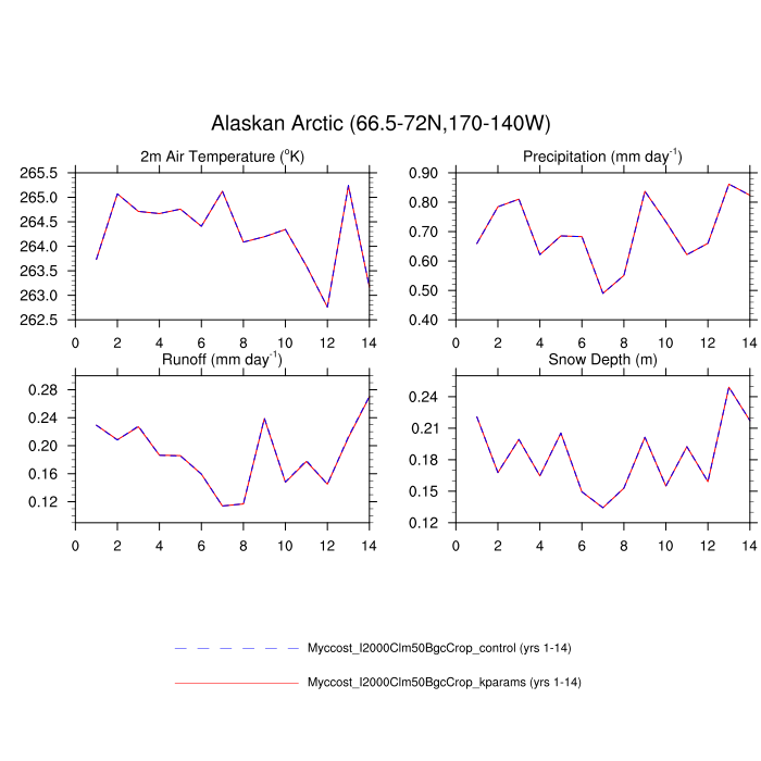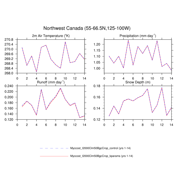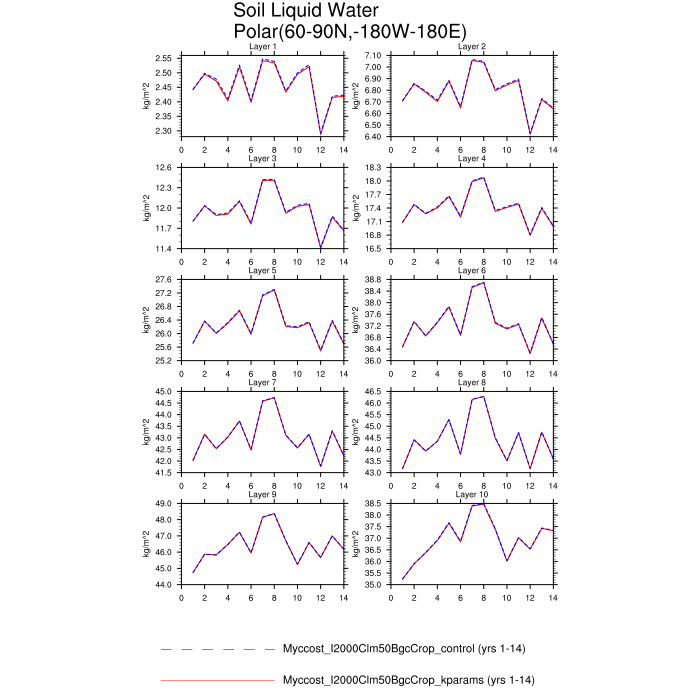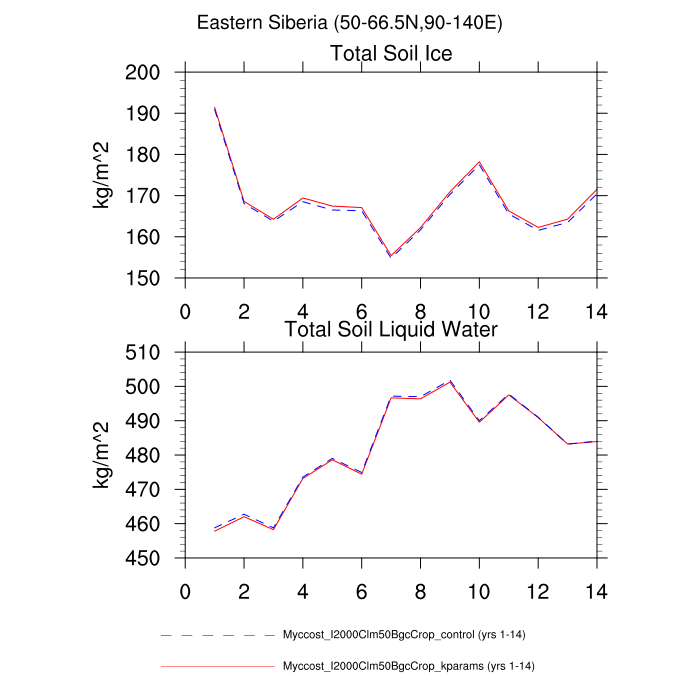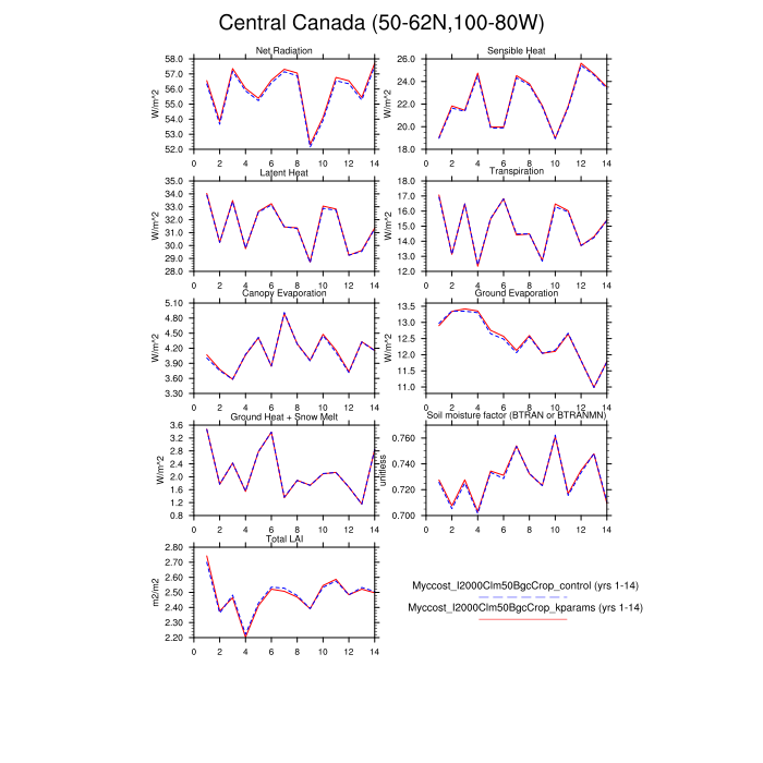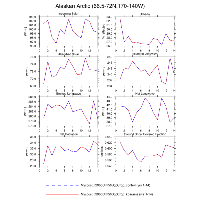 Set 6 Description: Line plots of annual trends in regional soil water/ice and temperature, runoff, snow water/ice, photosynthesis
