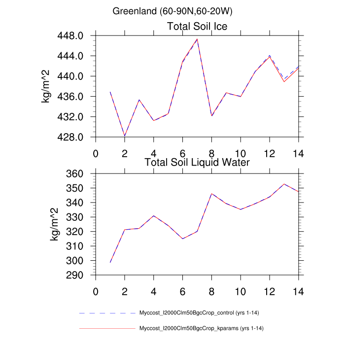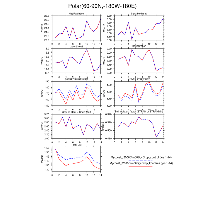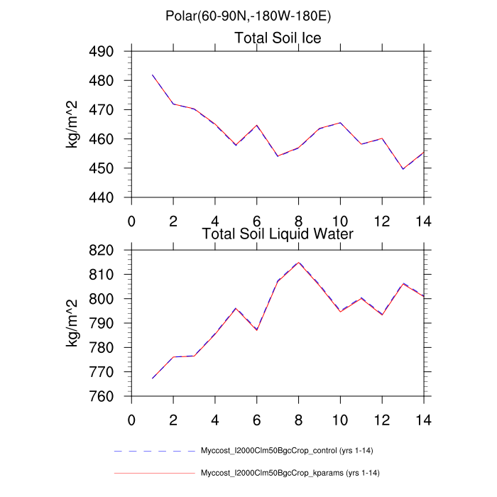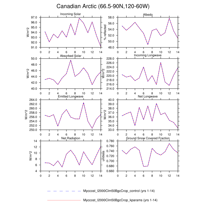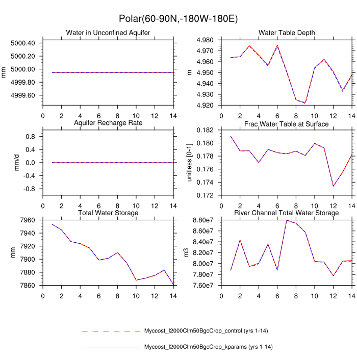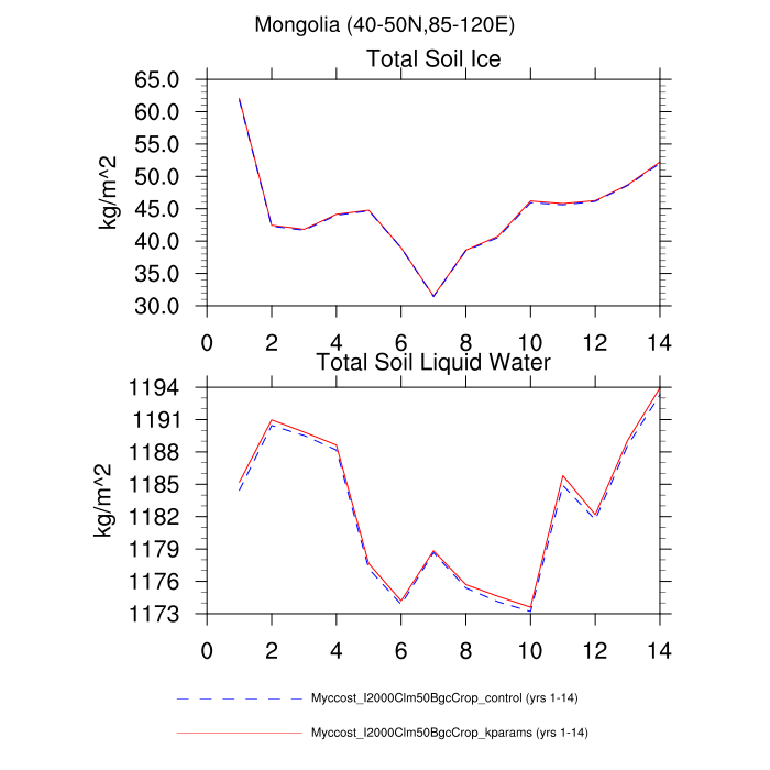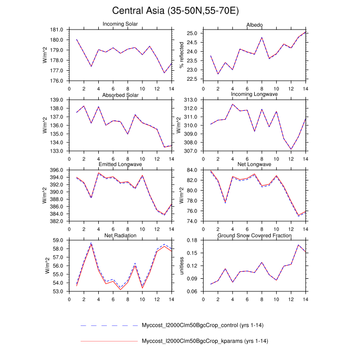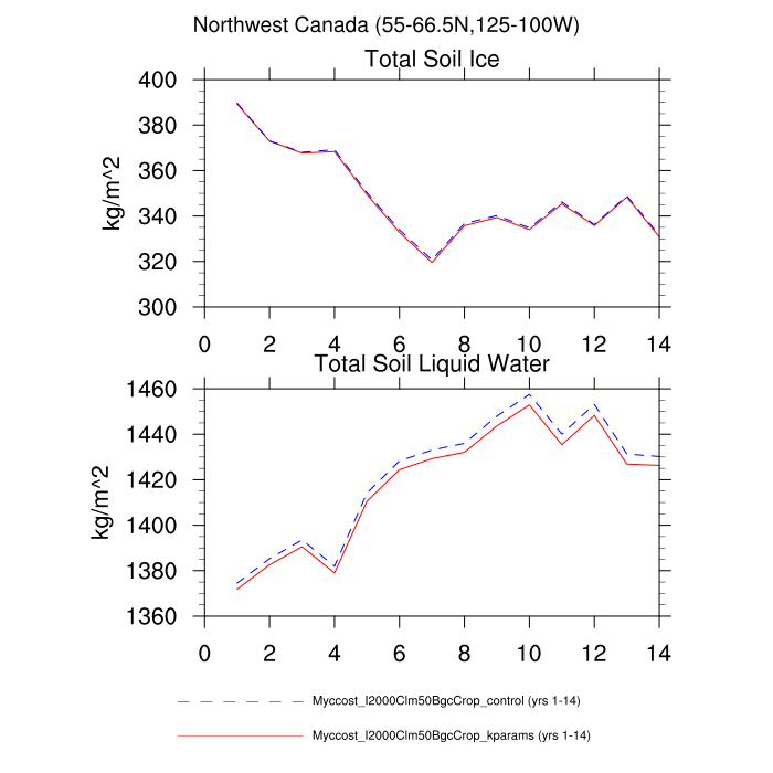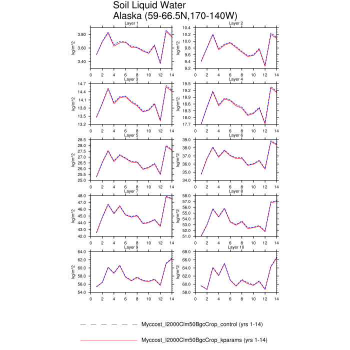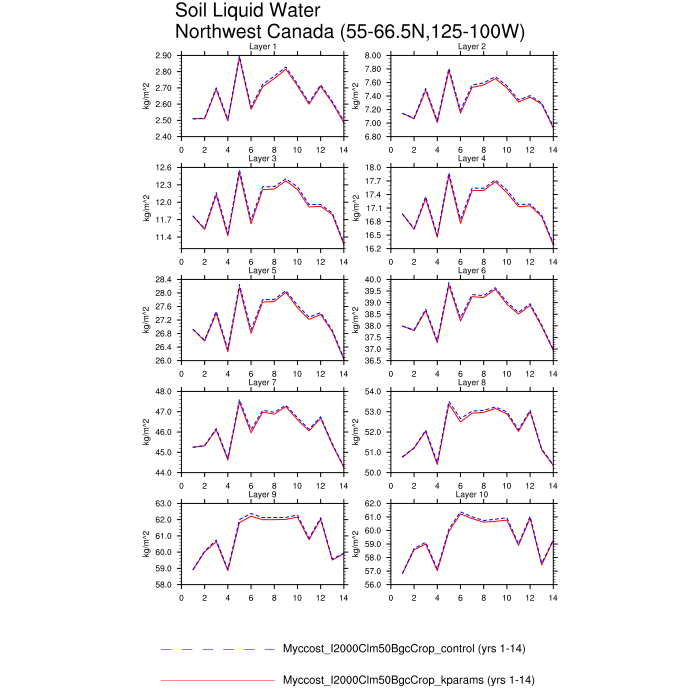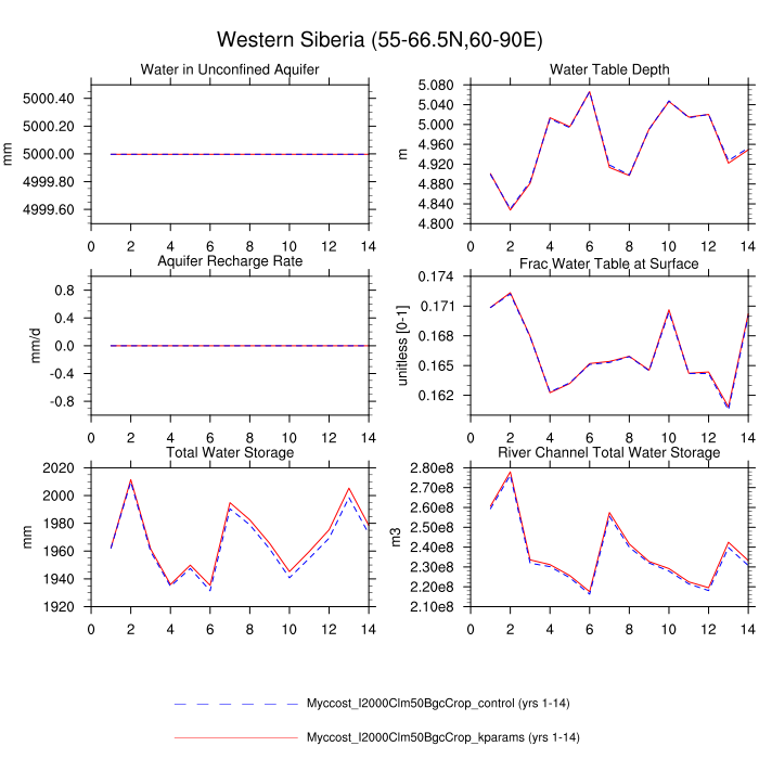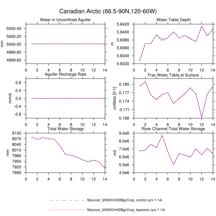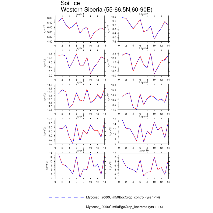 Set 6 Description: Line plots of annual trends in regional soil water/ice and temperature, runoff, snow water/ice, photosynthesis