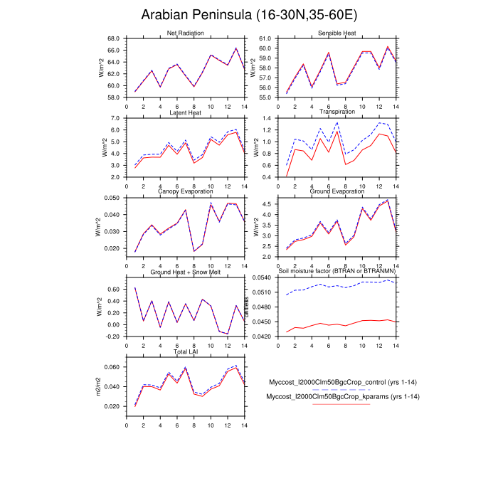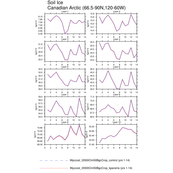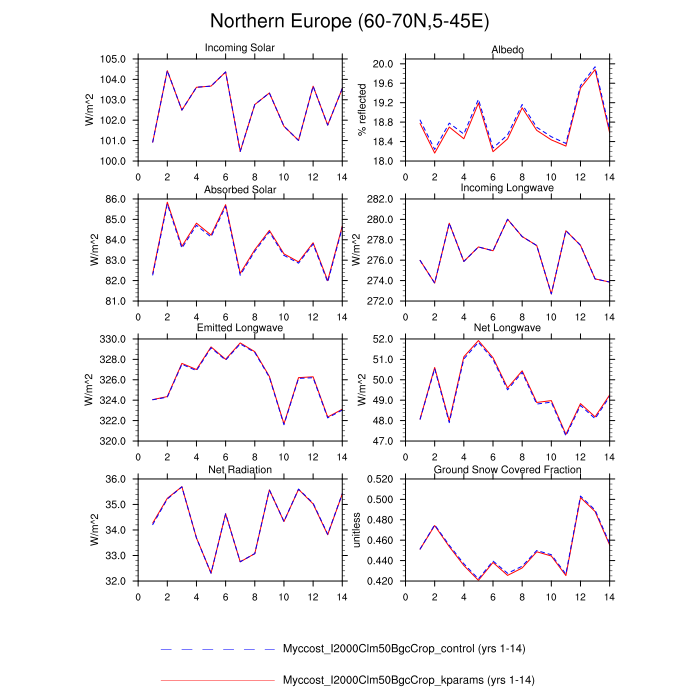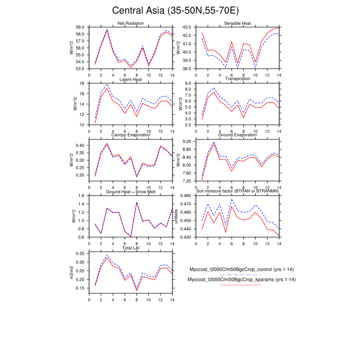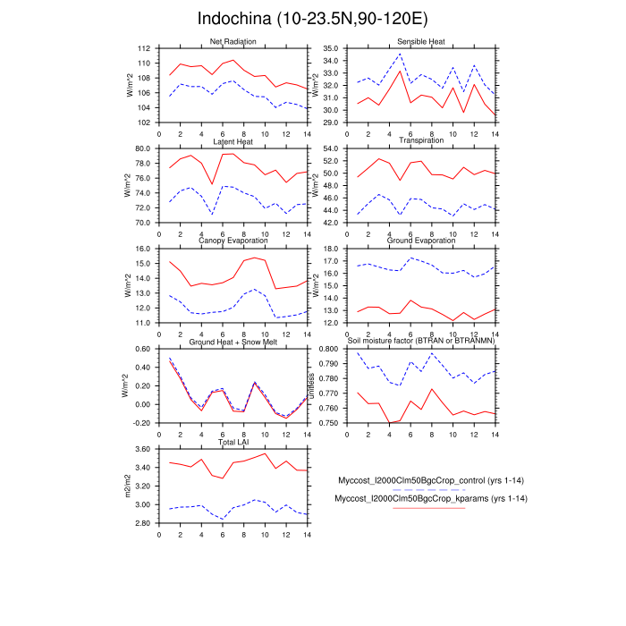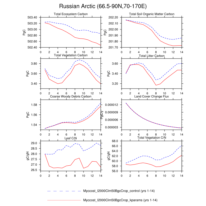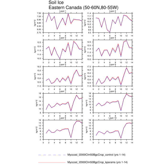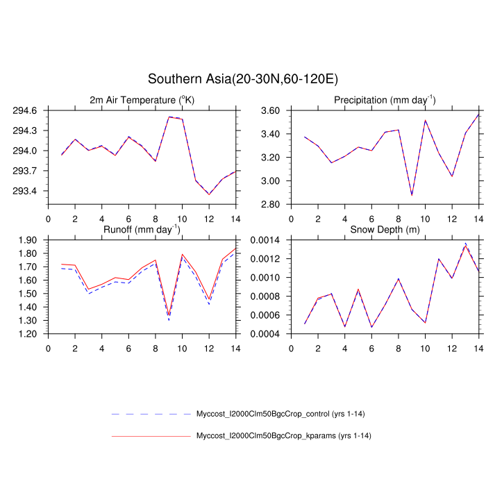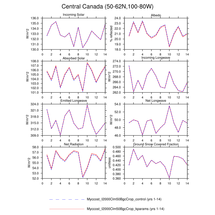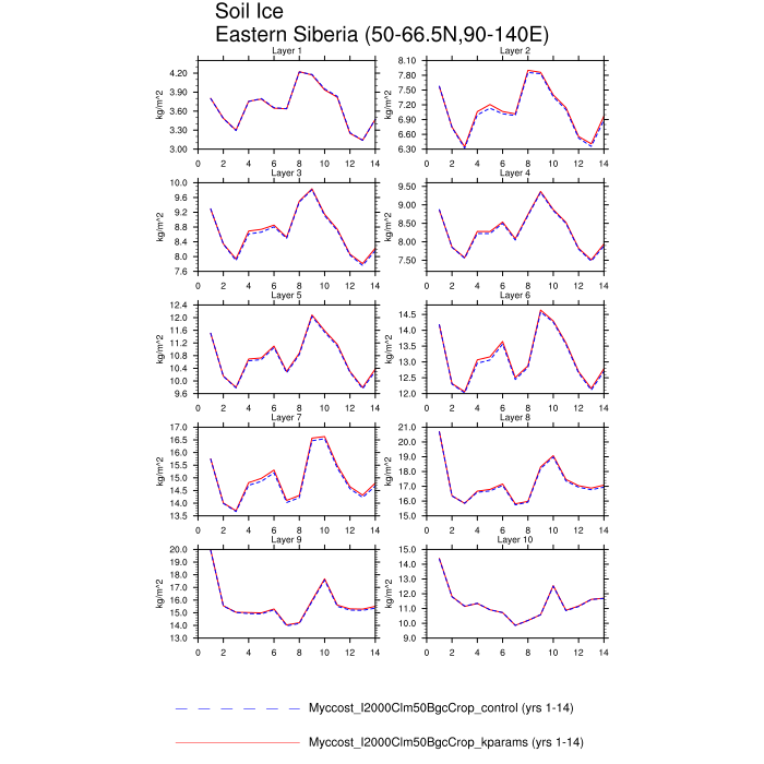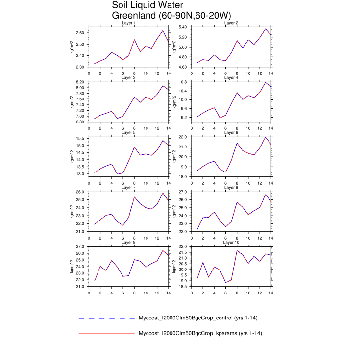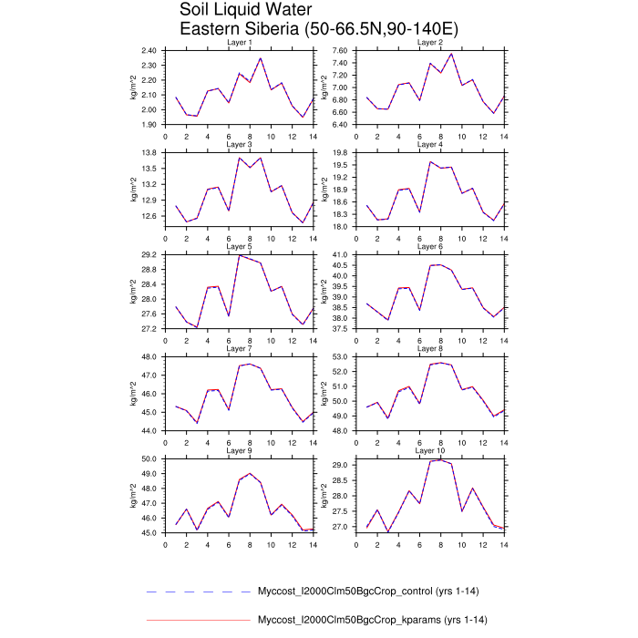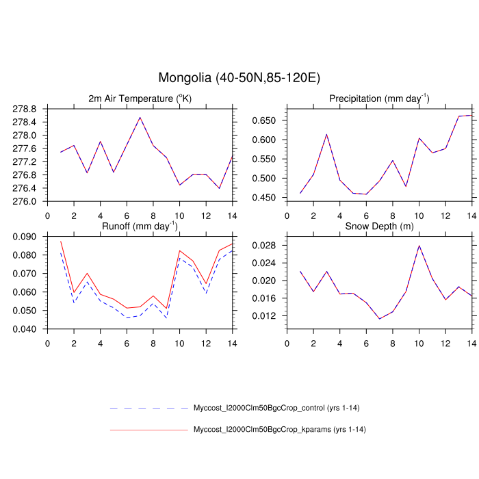 Set 6 Description: Line plots of annual trends in regional soil water/ice and temperature, runoff, snow water/ice, photosynthesis