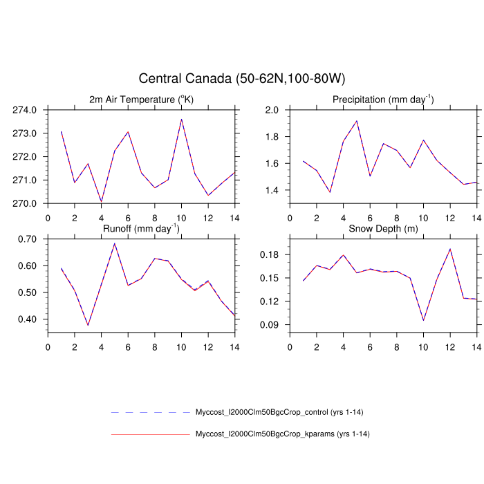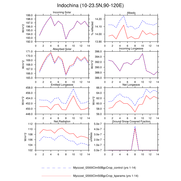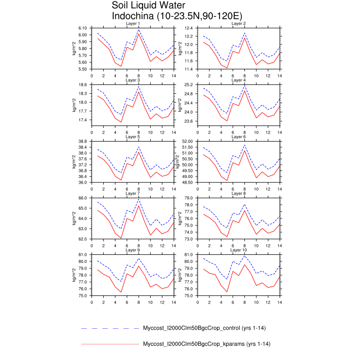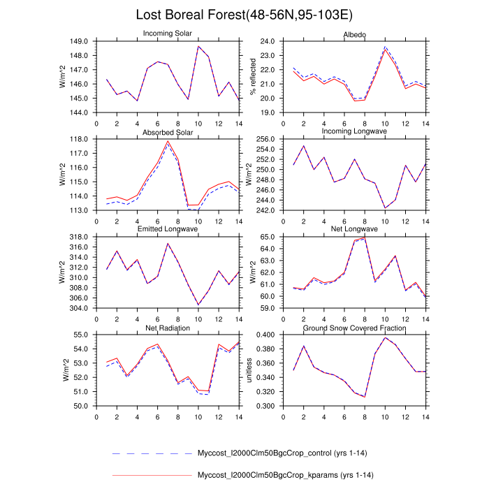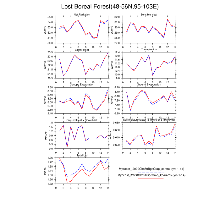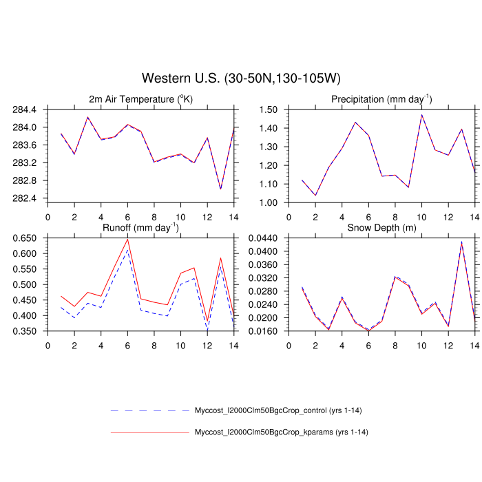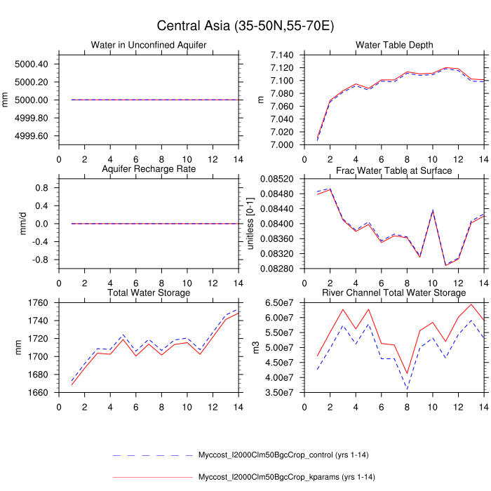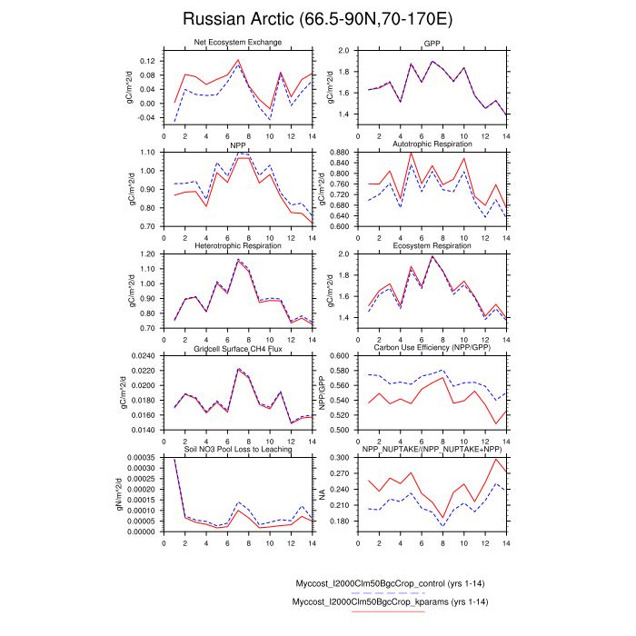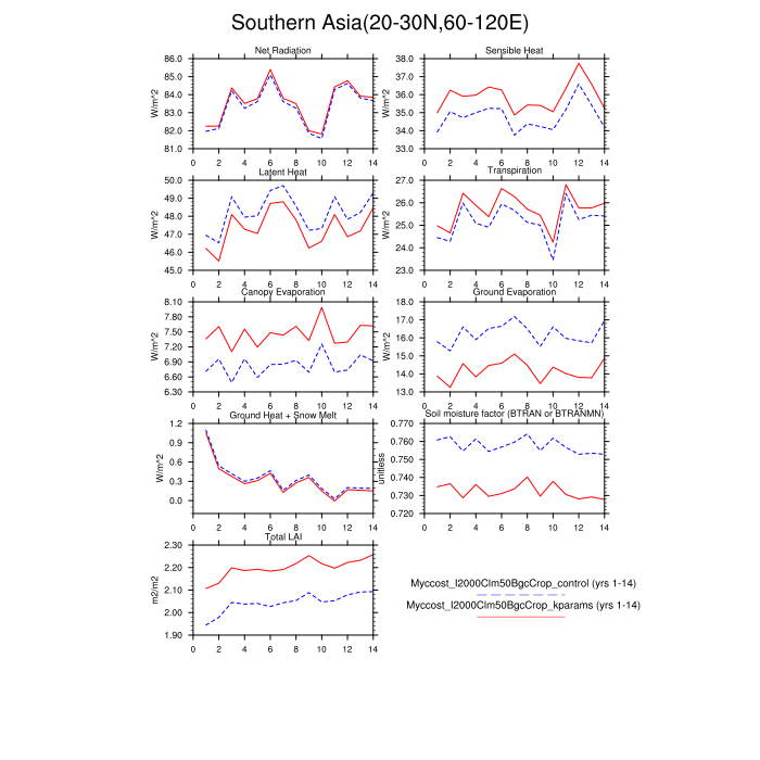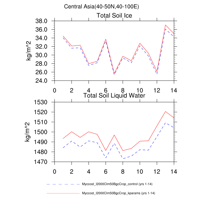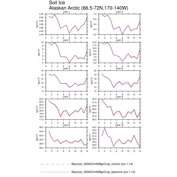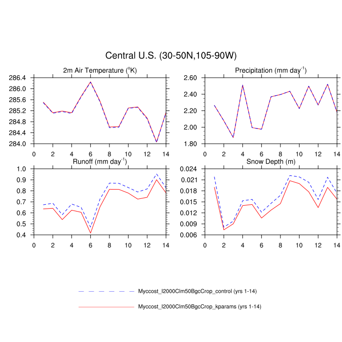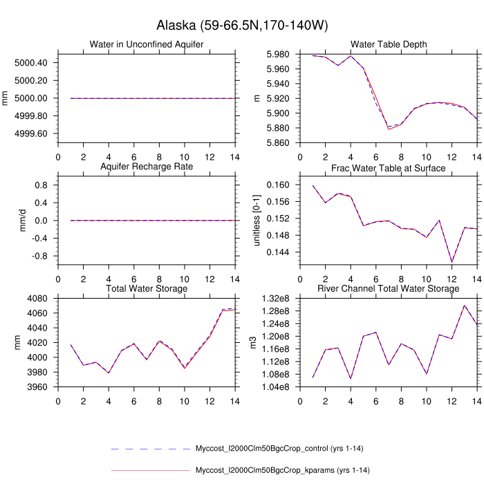 Set 6 Description: Line plots of annual trends in regional soil water/ice and temperature, runoff, snow water/ice, photosynthesis