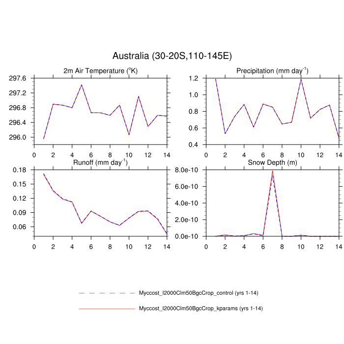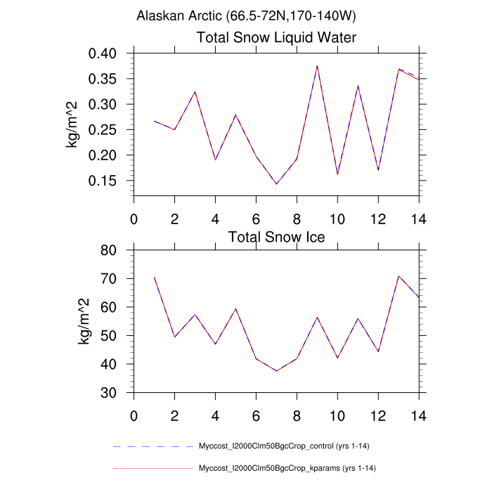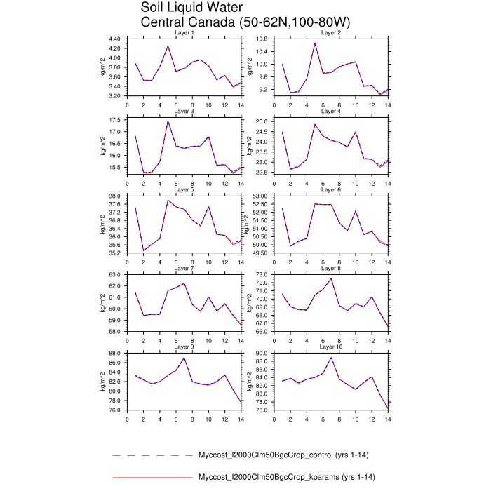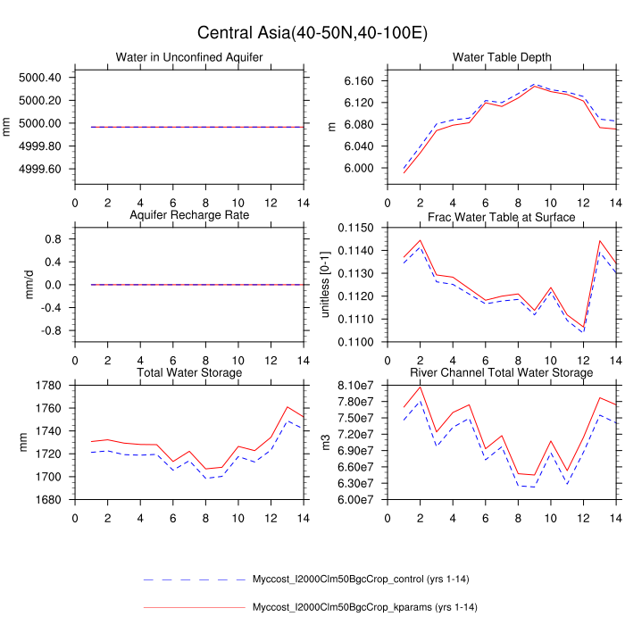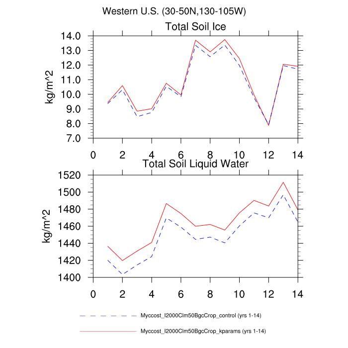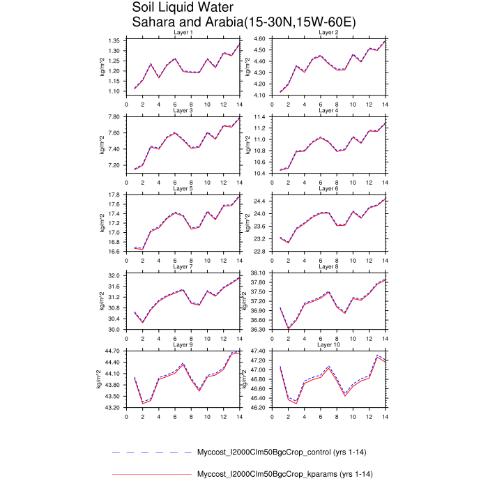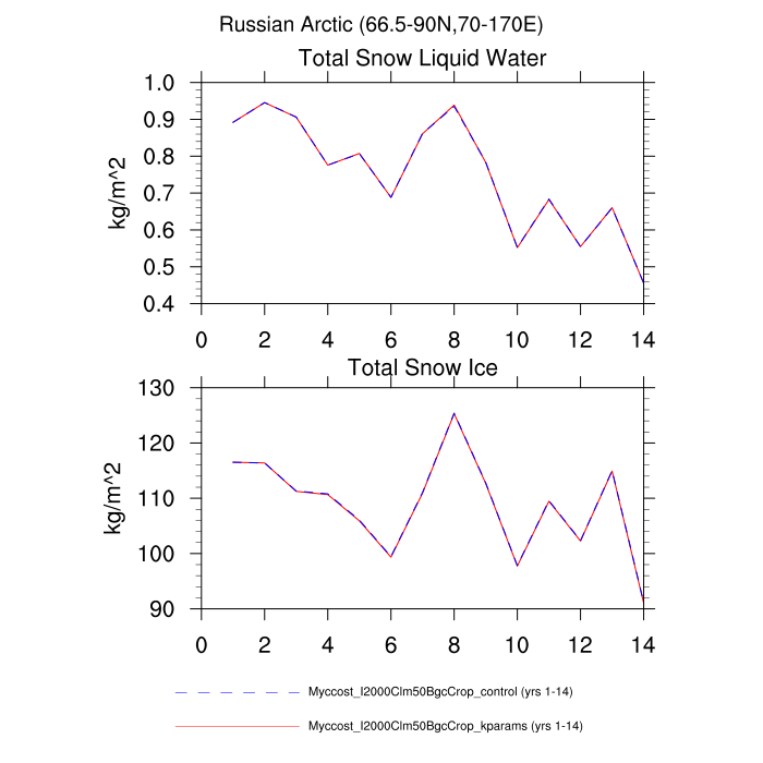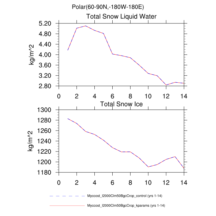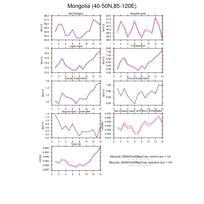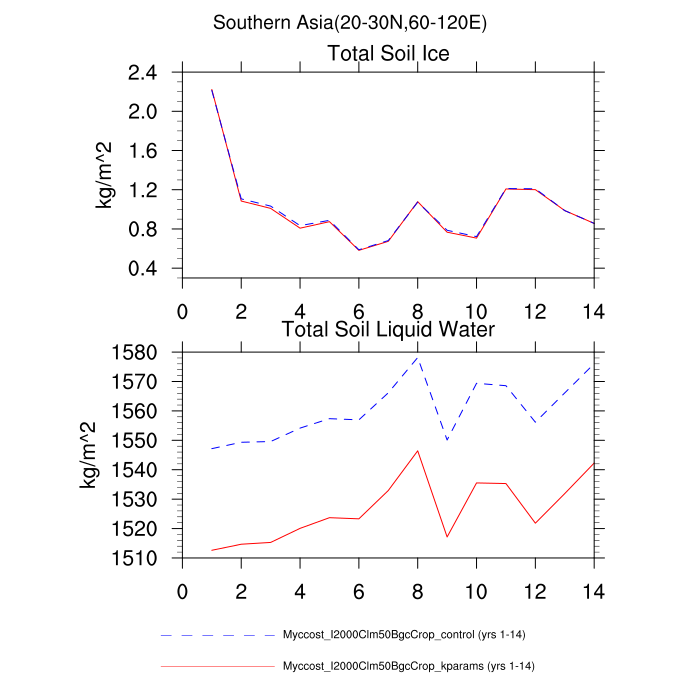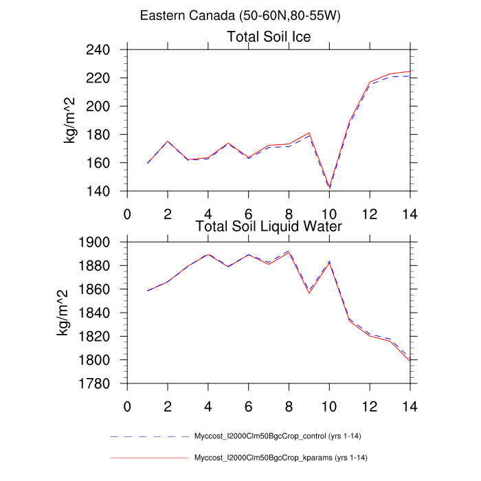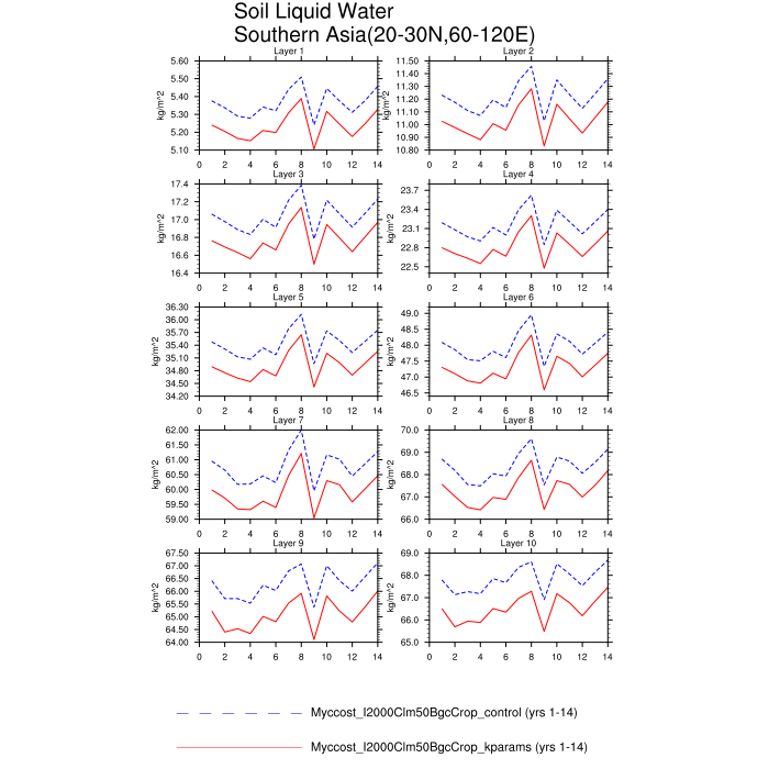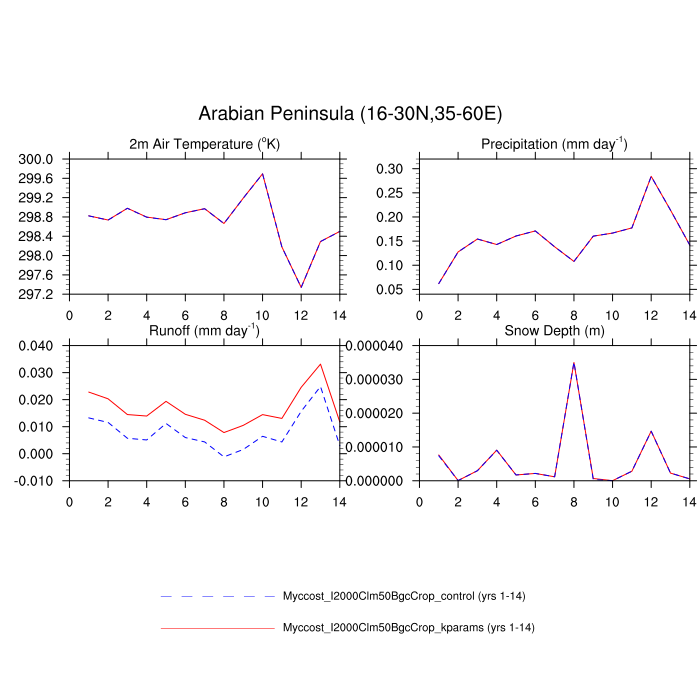 Set 6 Description: Line plots of annual trends in regional soil water/ice and temperature, runoff, snow water/ice, photosynthesis