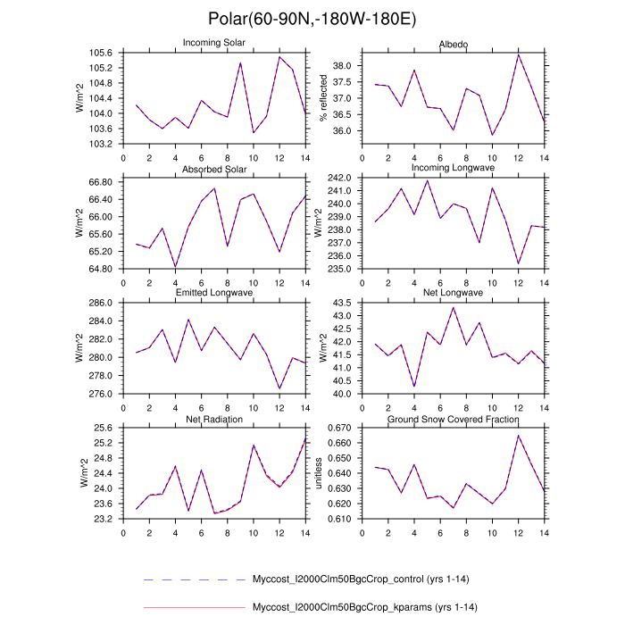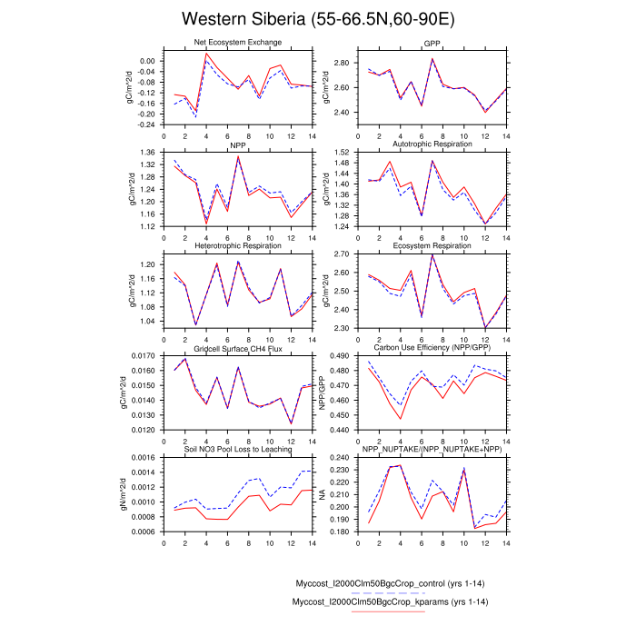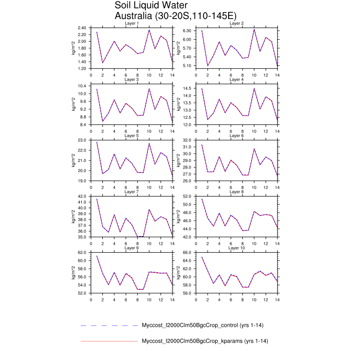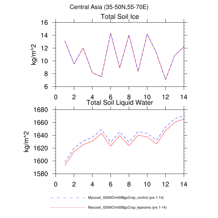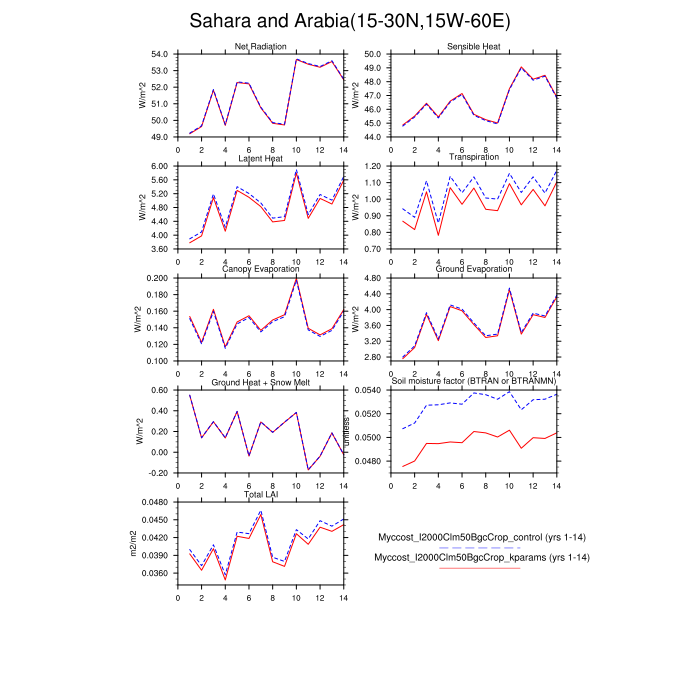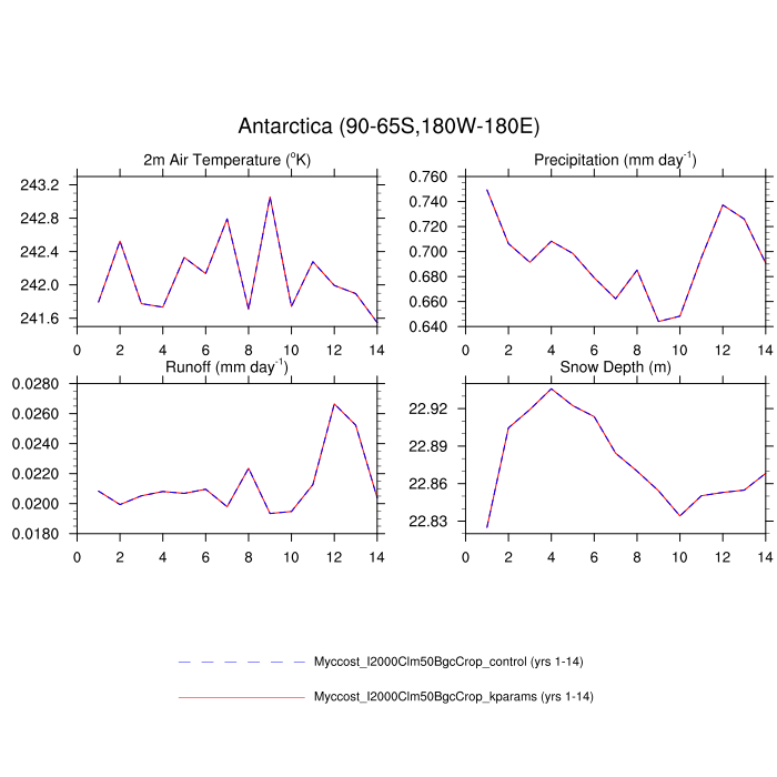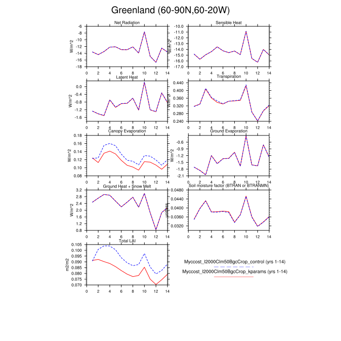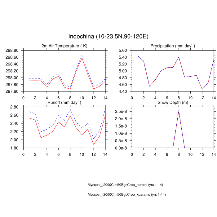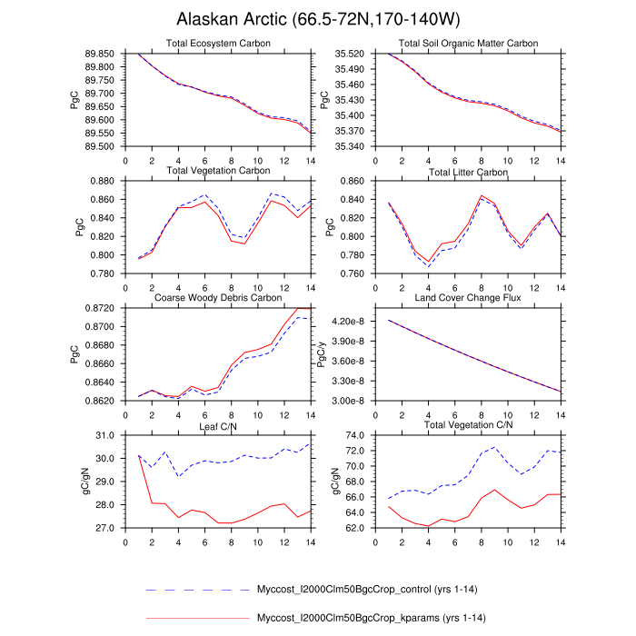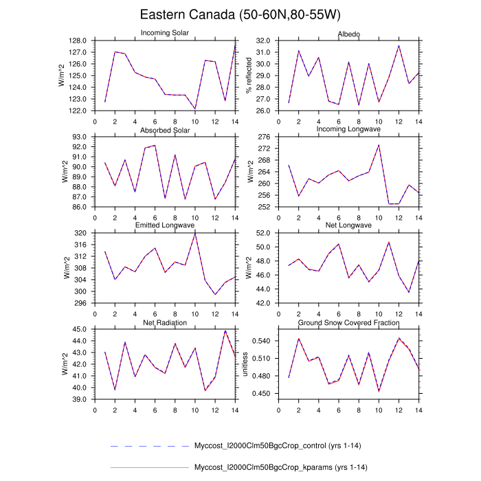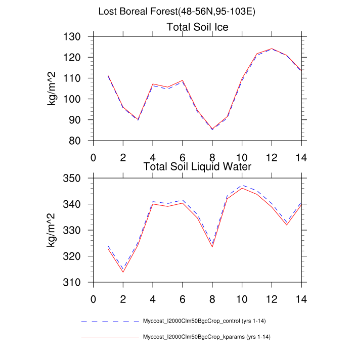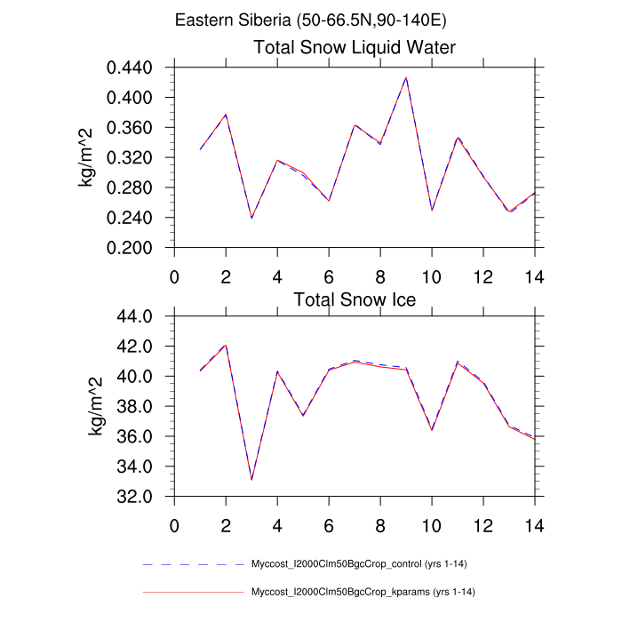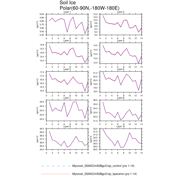 Set 6 Description: Line plots of annual trends in regional soil water/ice and temperature, runoff, snow water/ice, photosynthesis