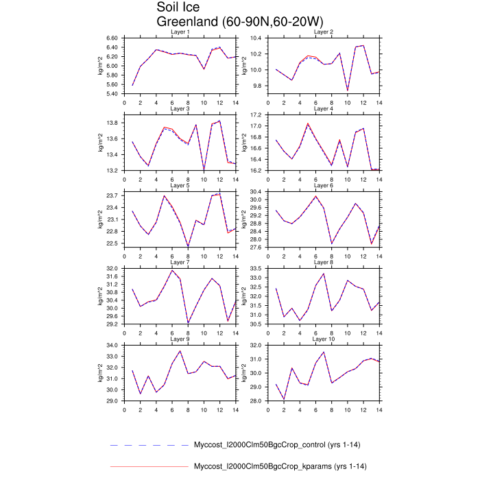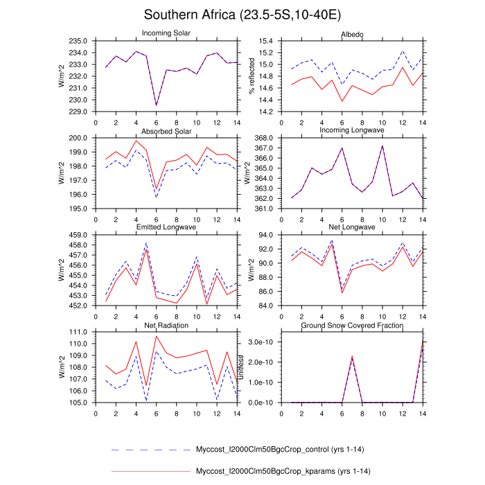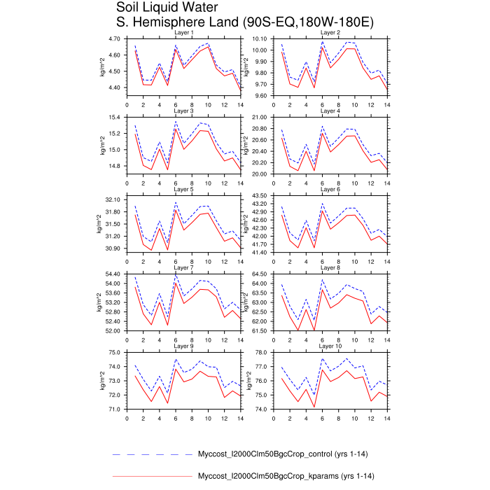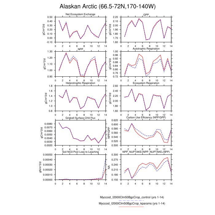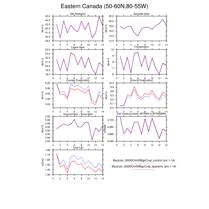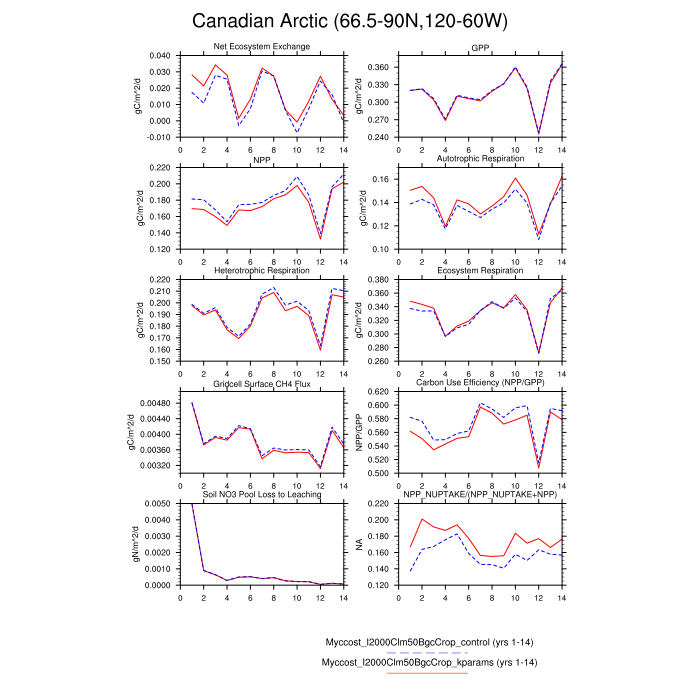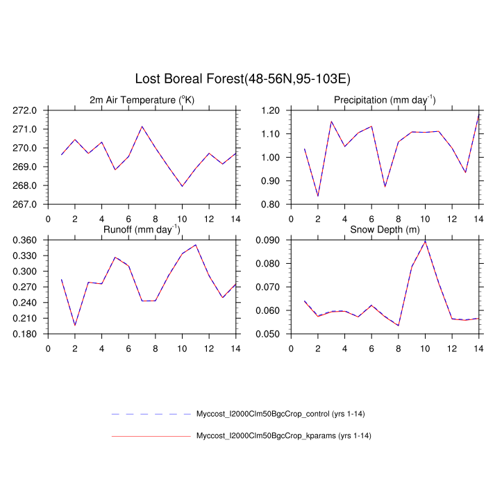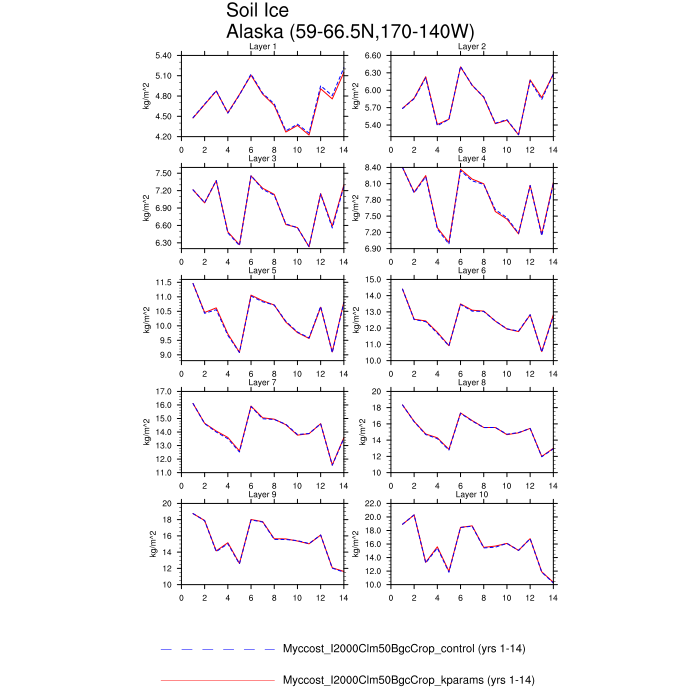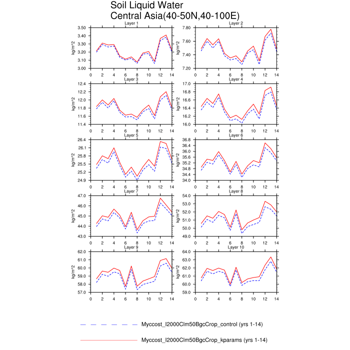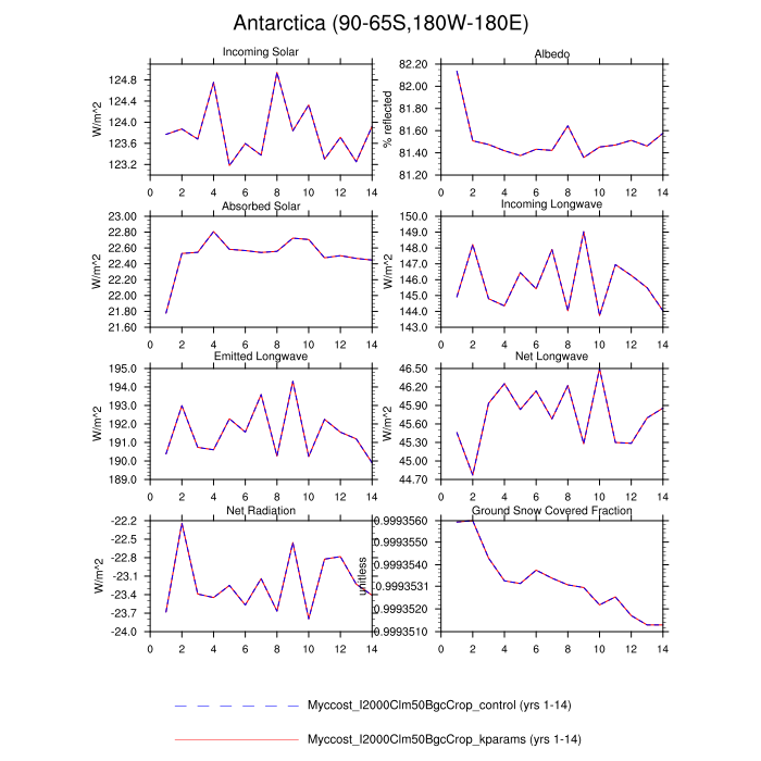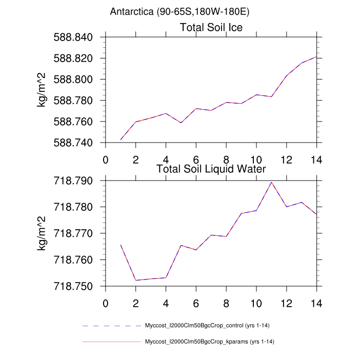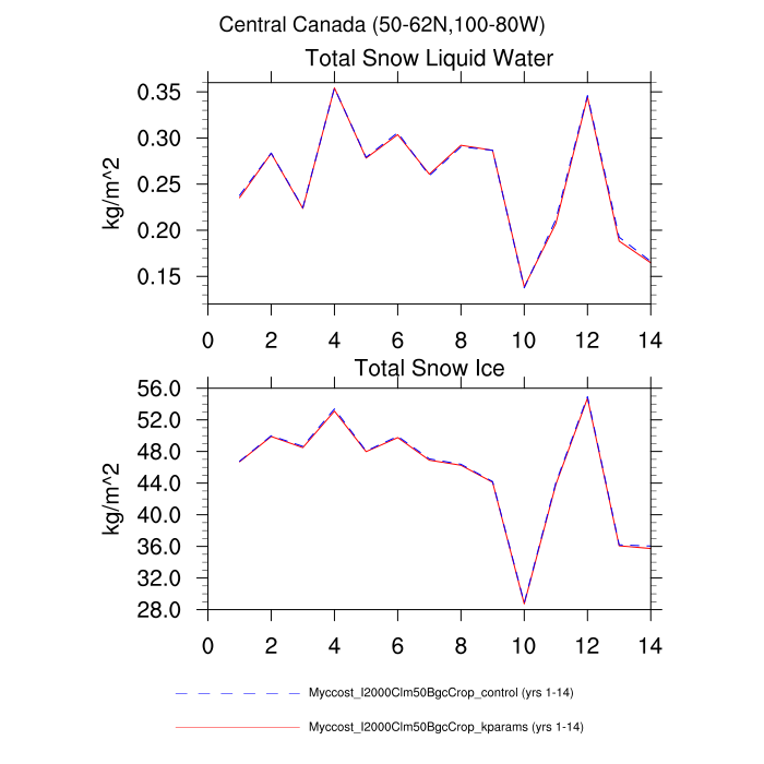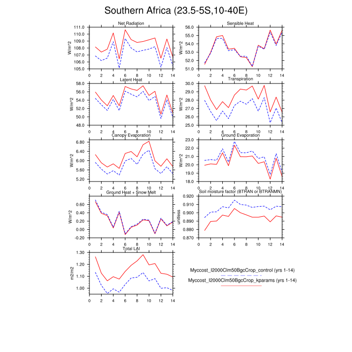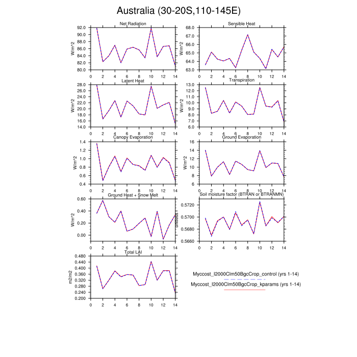Set 6 Description: Line plots of annual trends in regional soil water/ice and temperature, runoff, snow water/ice, photosynthesis