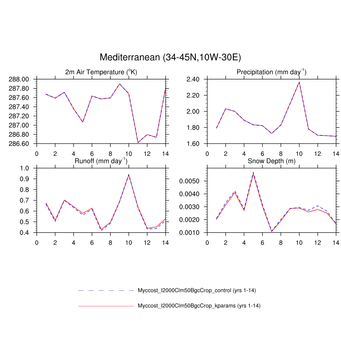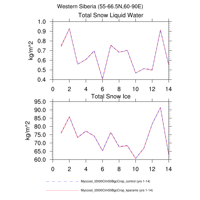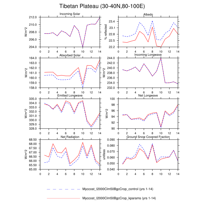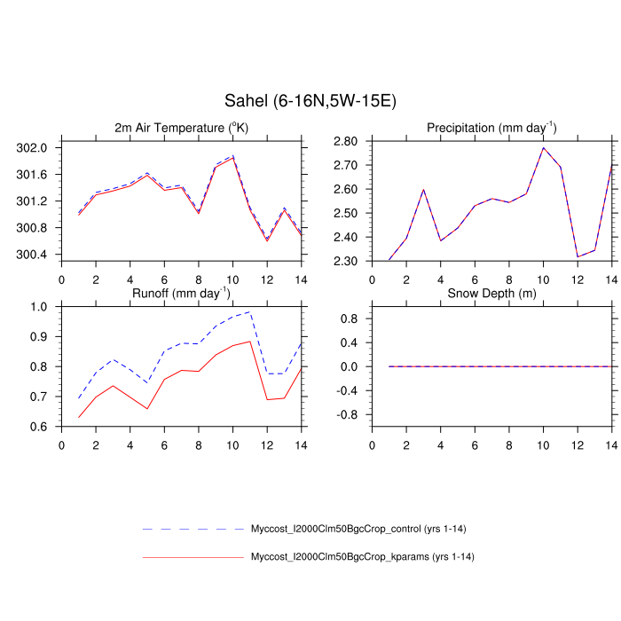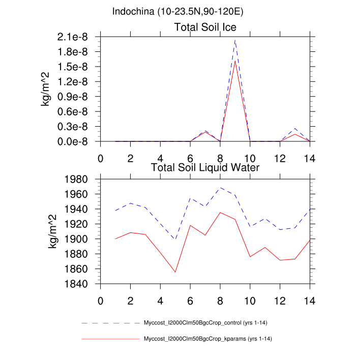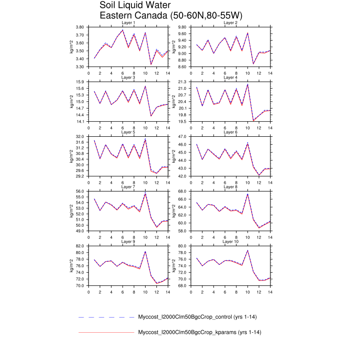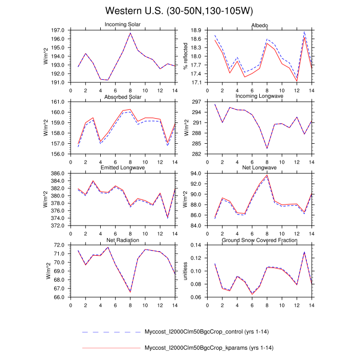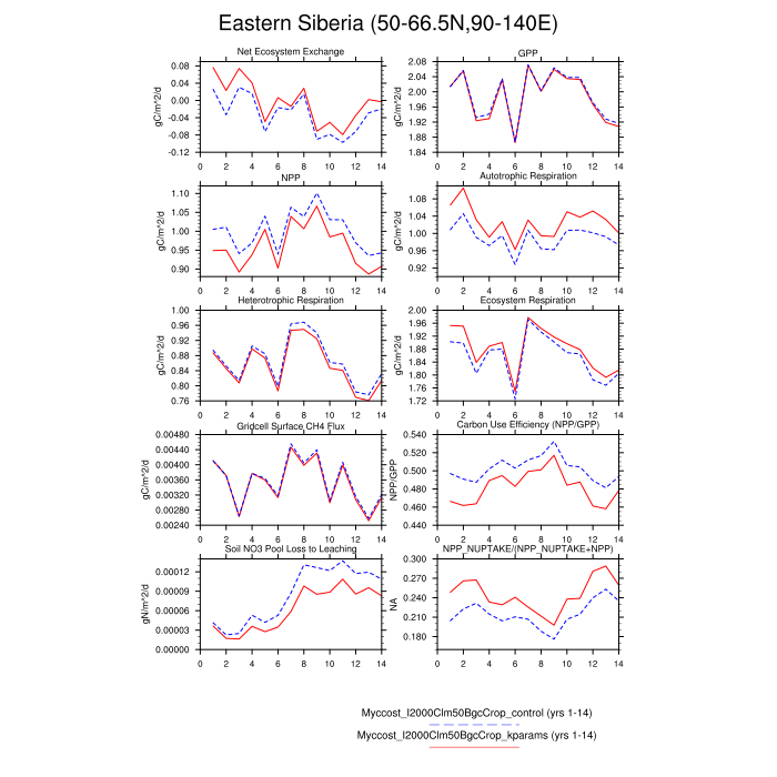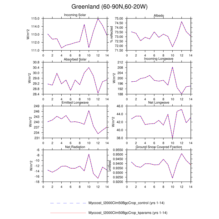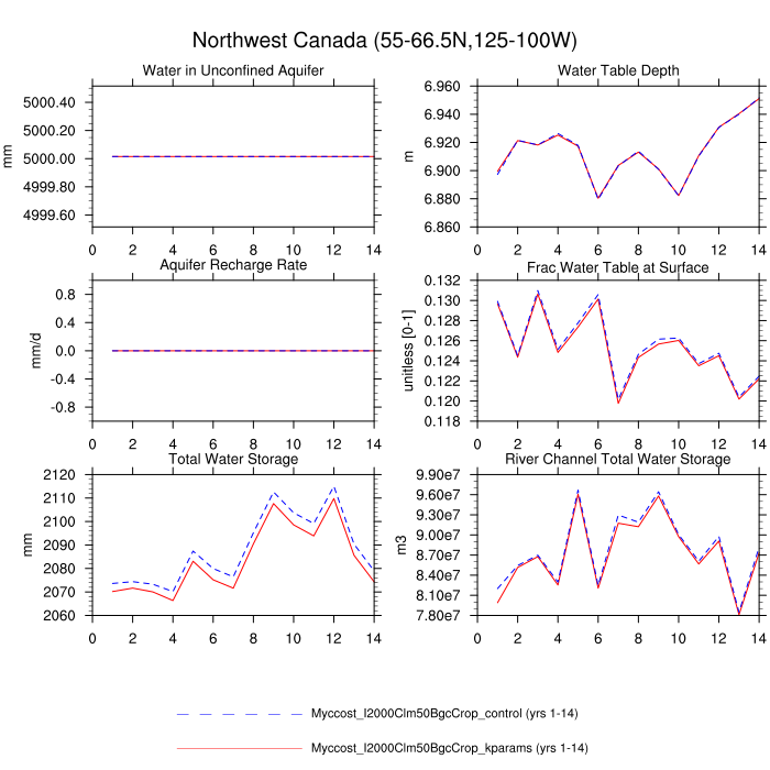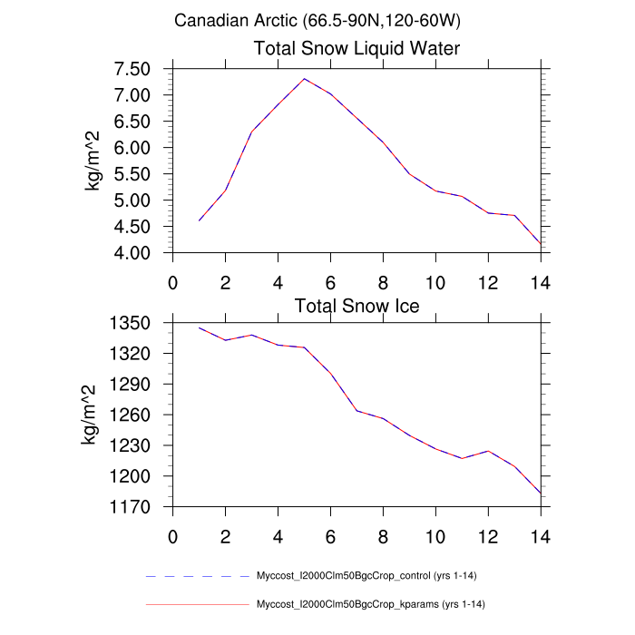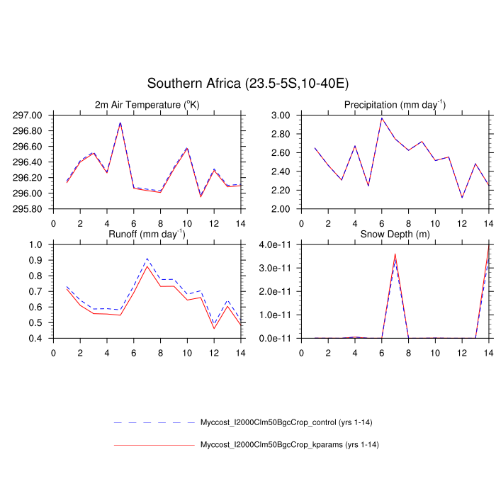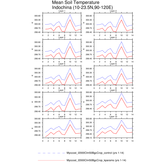 Set 6 Description: Line plots of annual trends in regional soil water/ice and temperature, runoff, snow water/ice, photosynthesis
