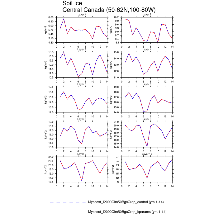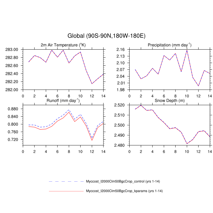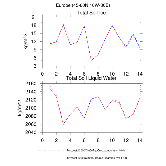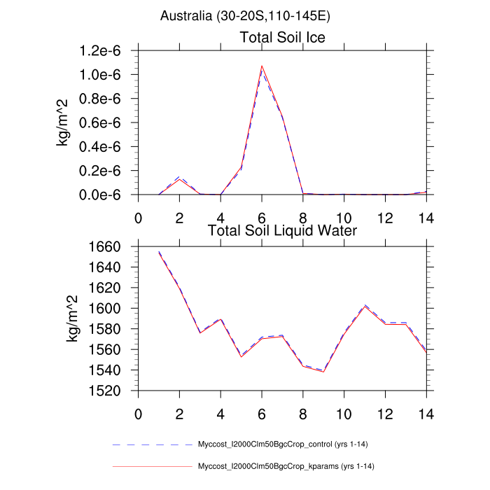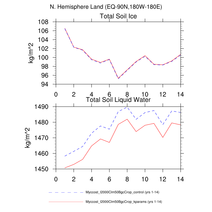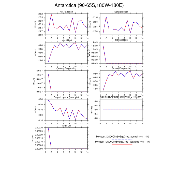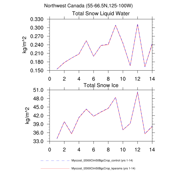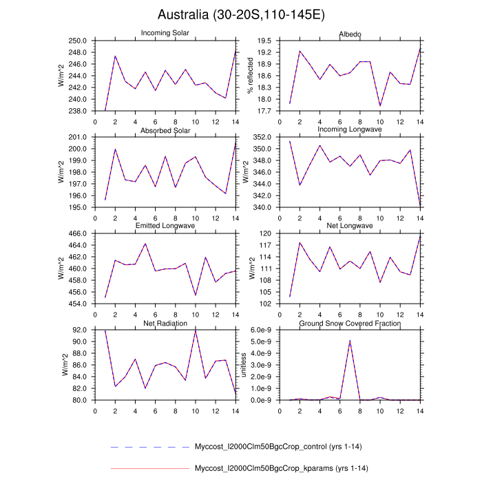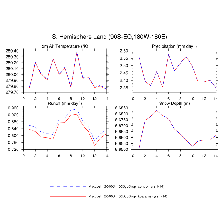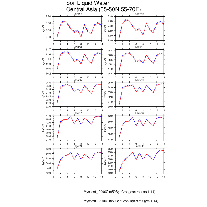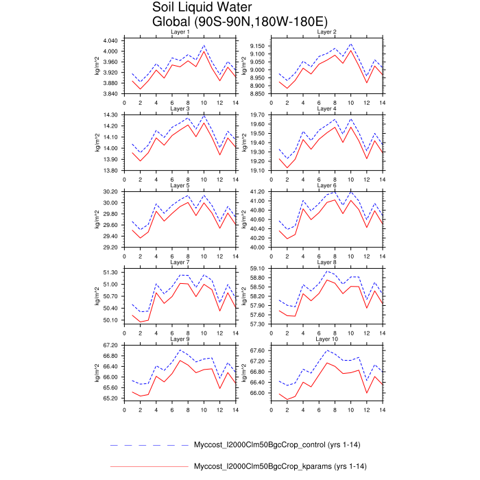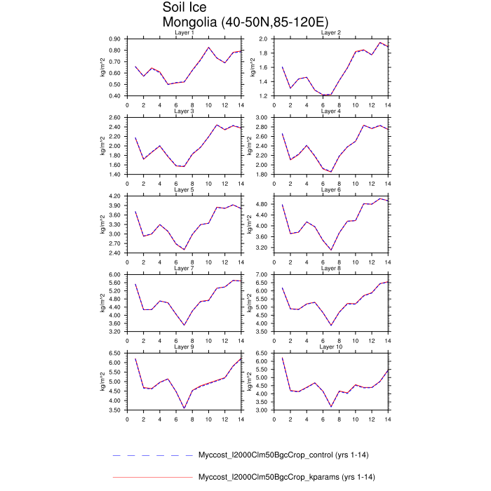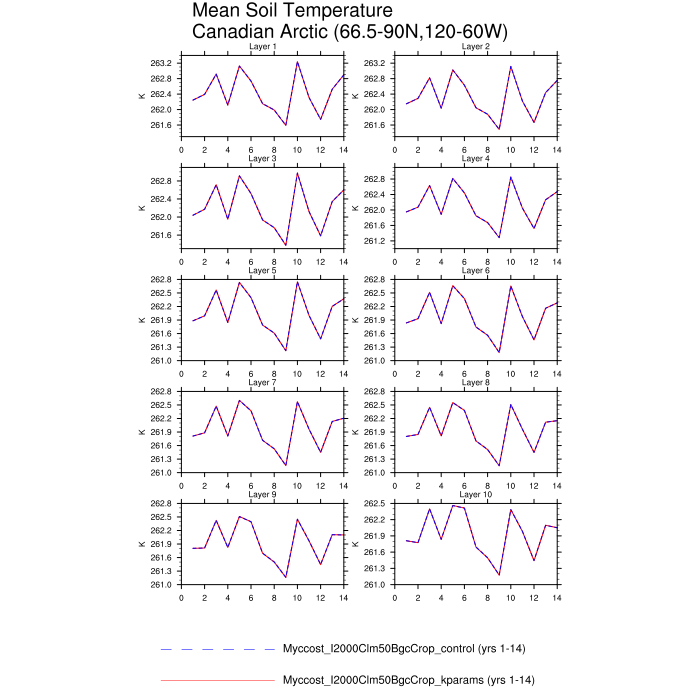 Set 6 Description: Line plots of annual trends in regional soil water/ice and temperature, runoff, snow water/ice, photosynthesis