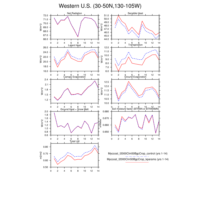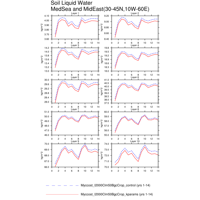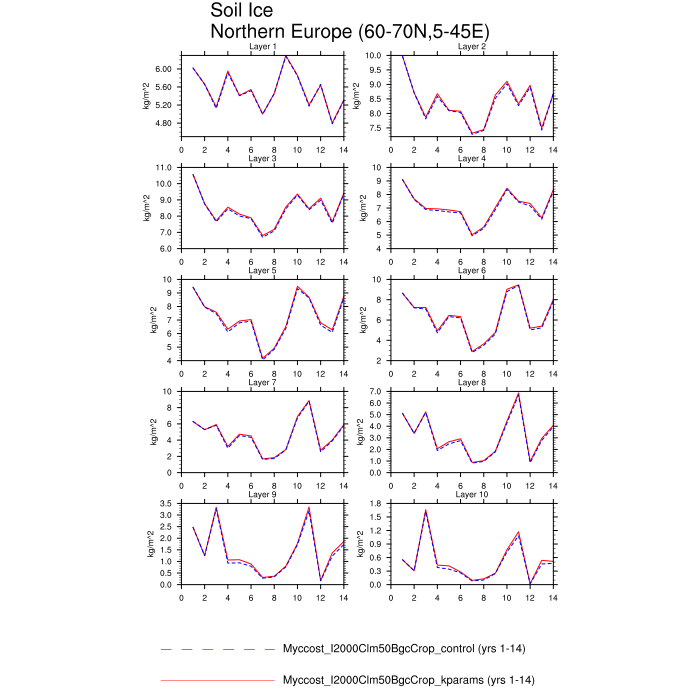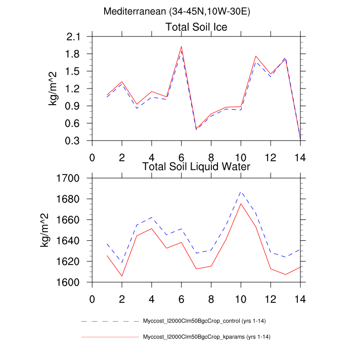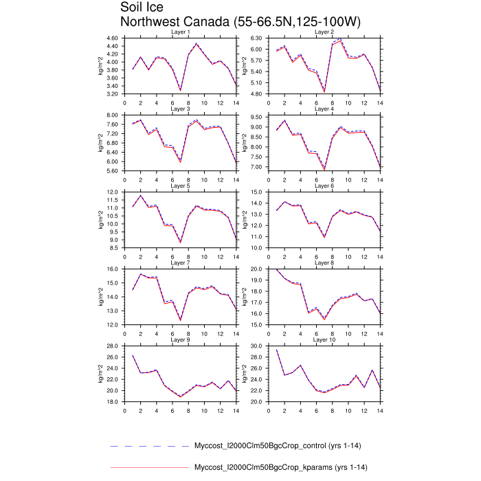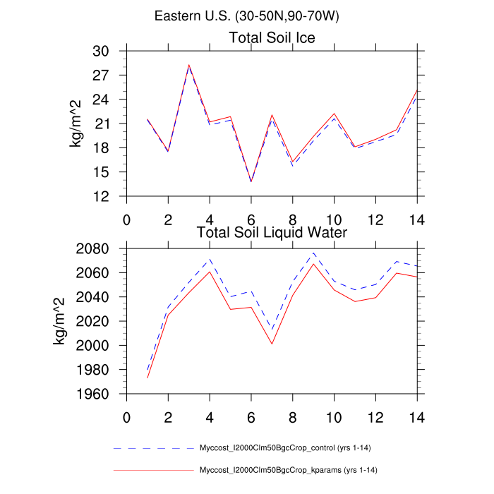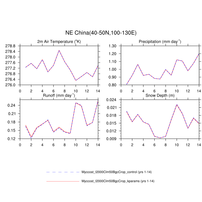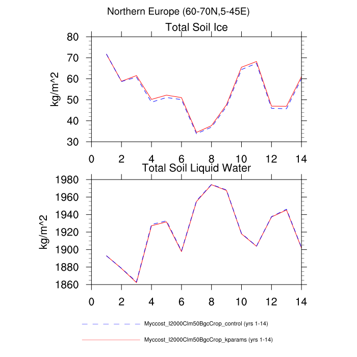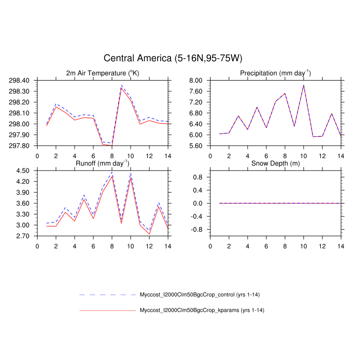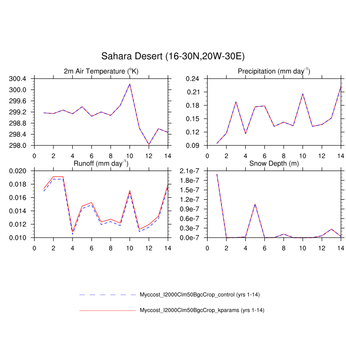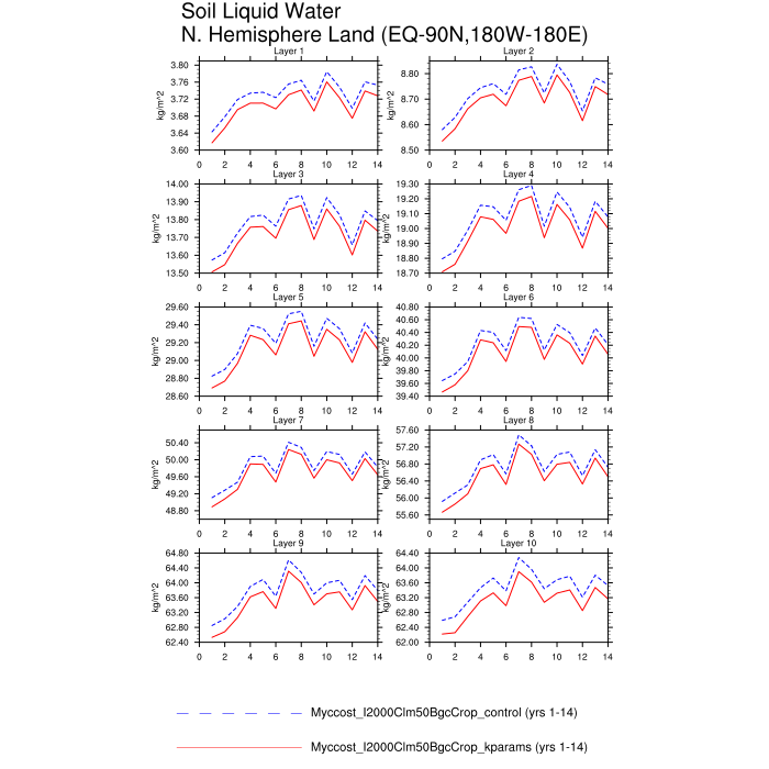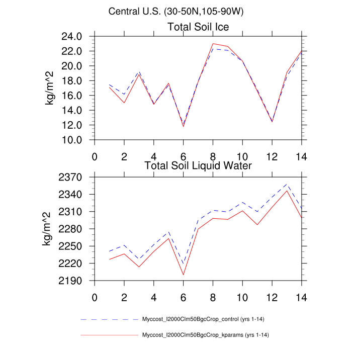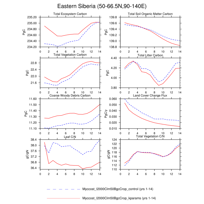 Set 6 Description: Line plots of annual trends in regional soil water/ice and temperature, runoff, snow water/ice, photosynthesis