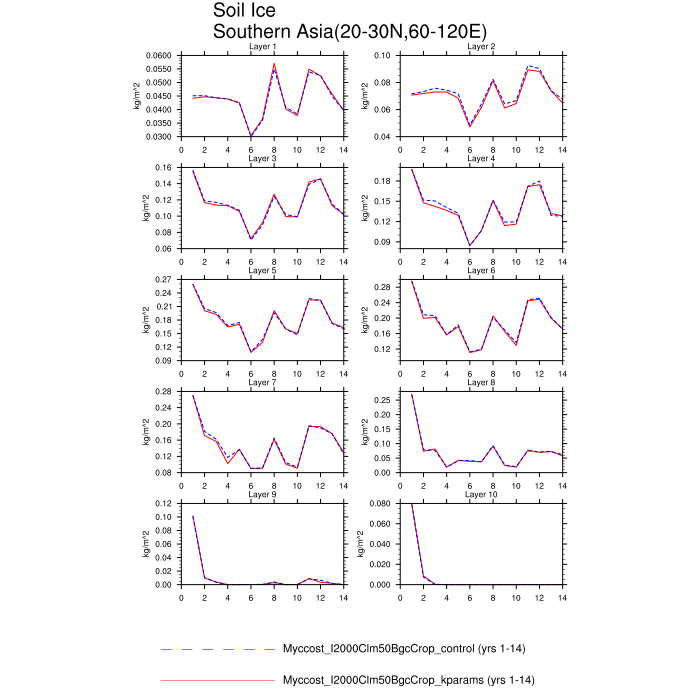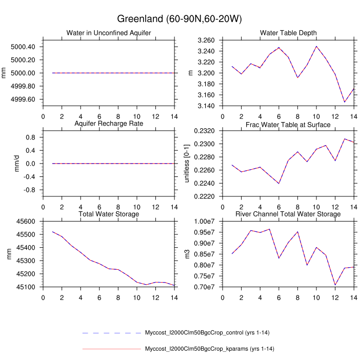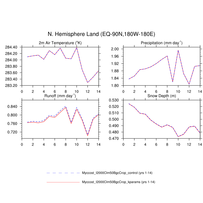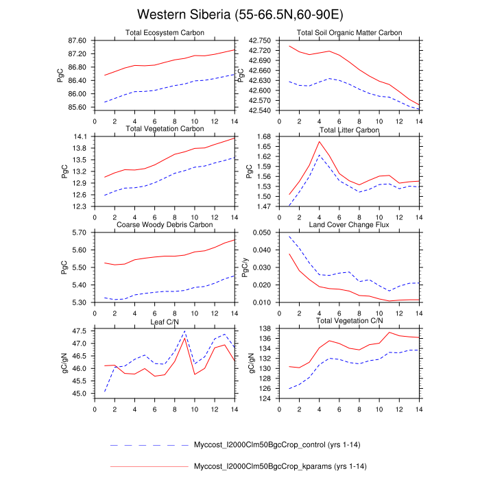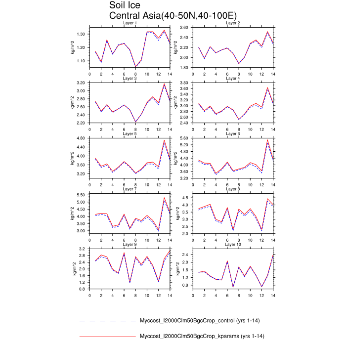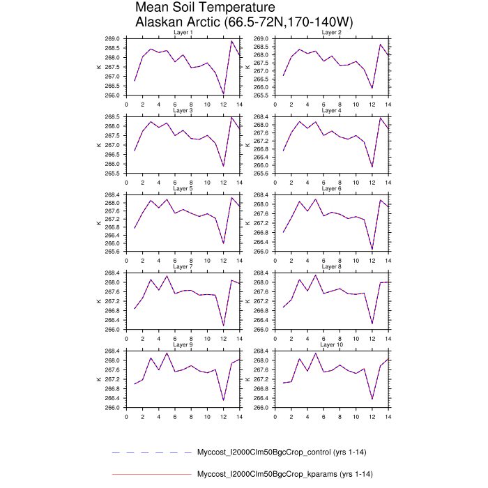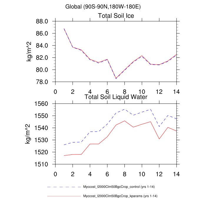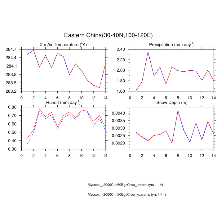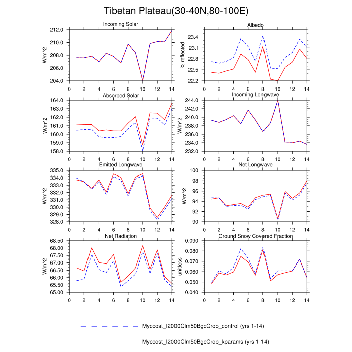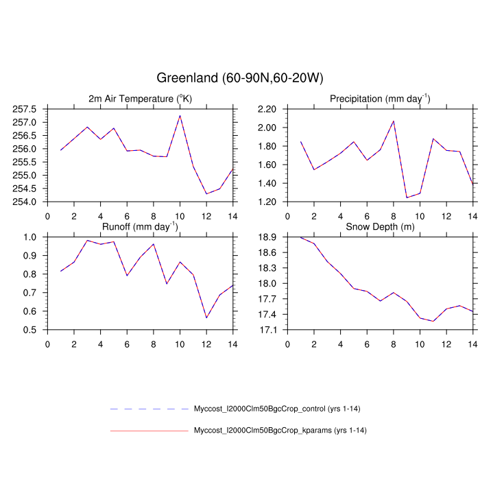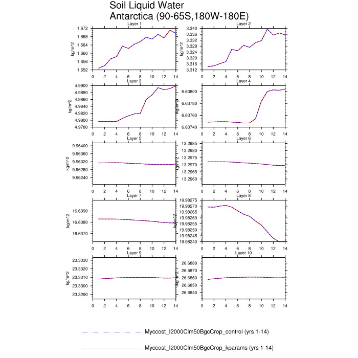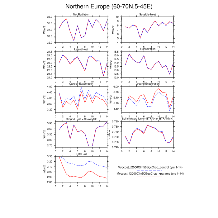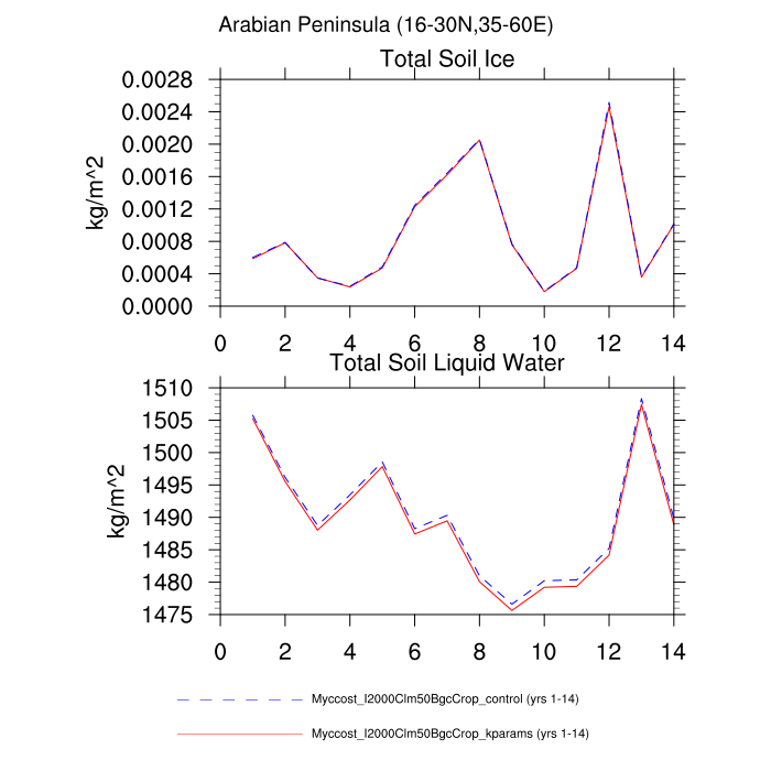 Set 6 Description: Line plots of annual trends in regional soil water/ice and temperature, runoff, snow water/ice, photosynthesis