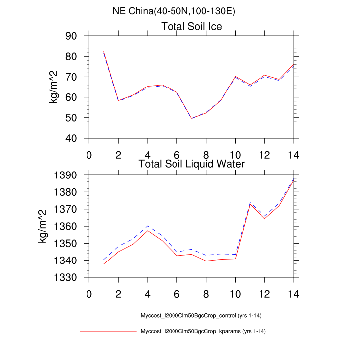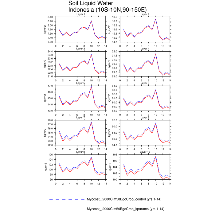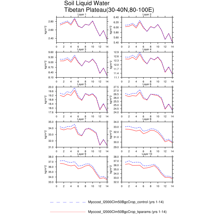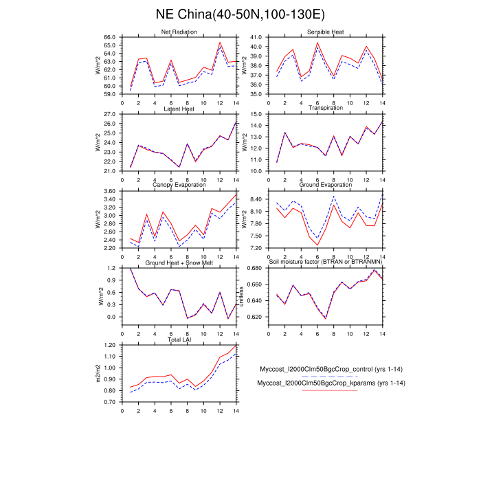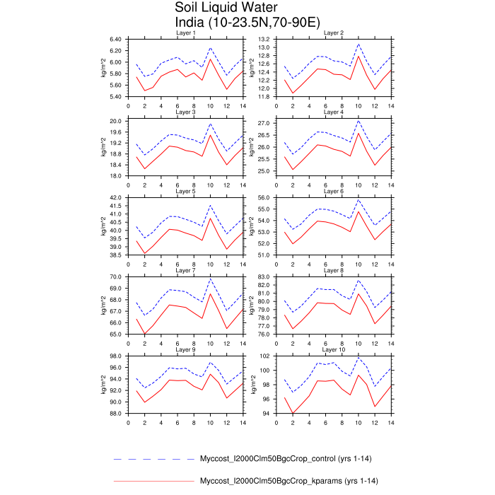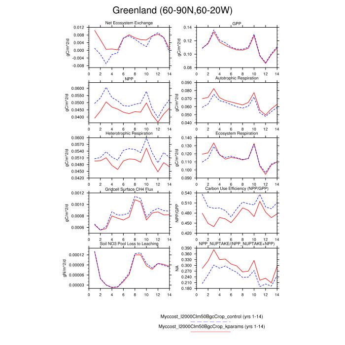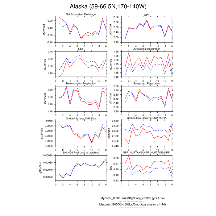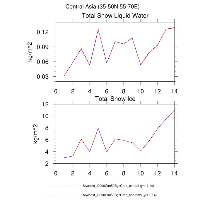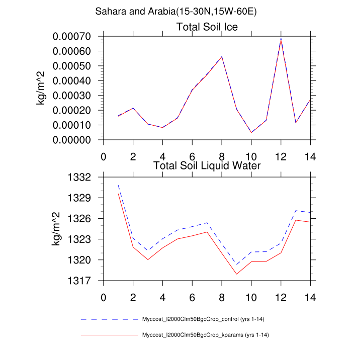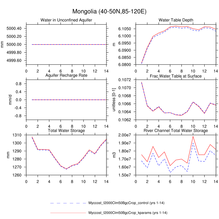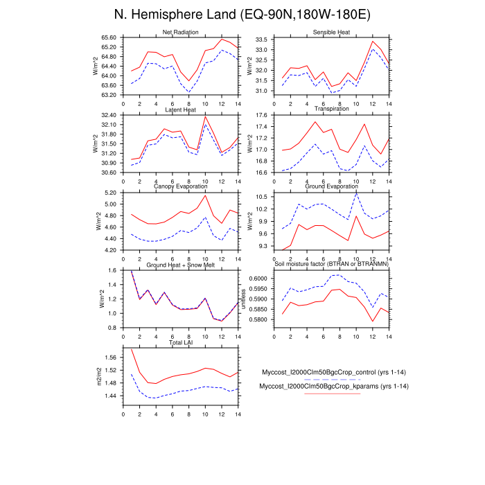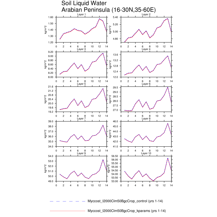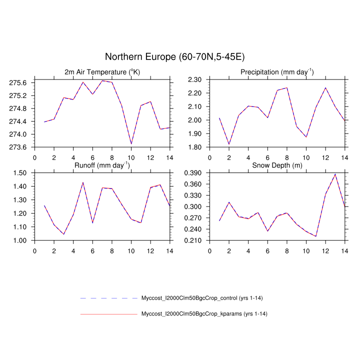 Set 6 Description: Line plots of annual trends in regional soil water/ice and temperature, runoff, snow water/ice, photosynthesis