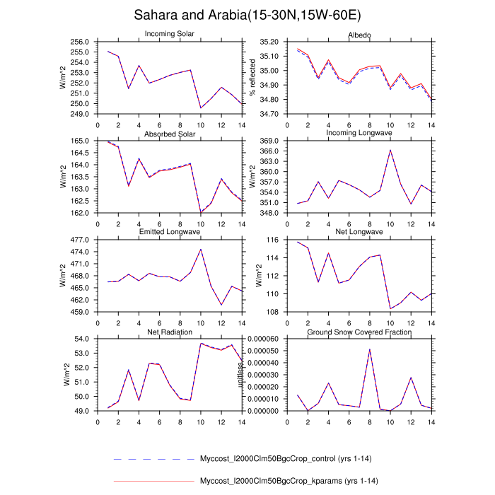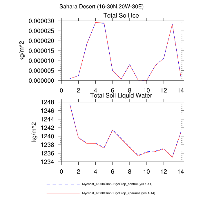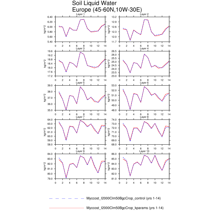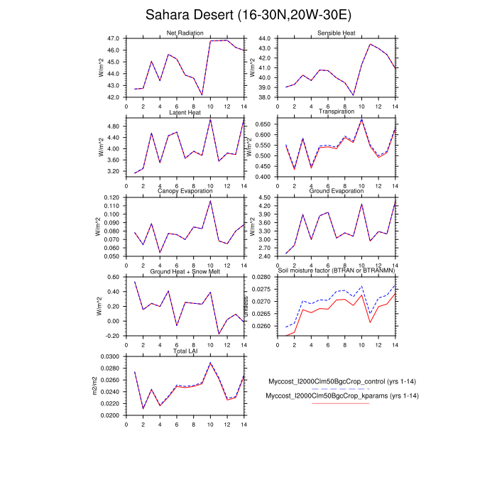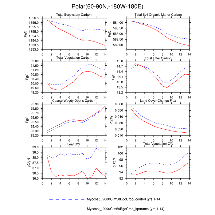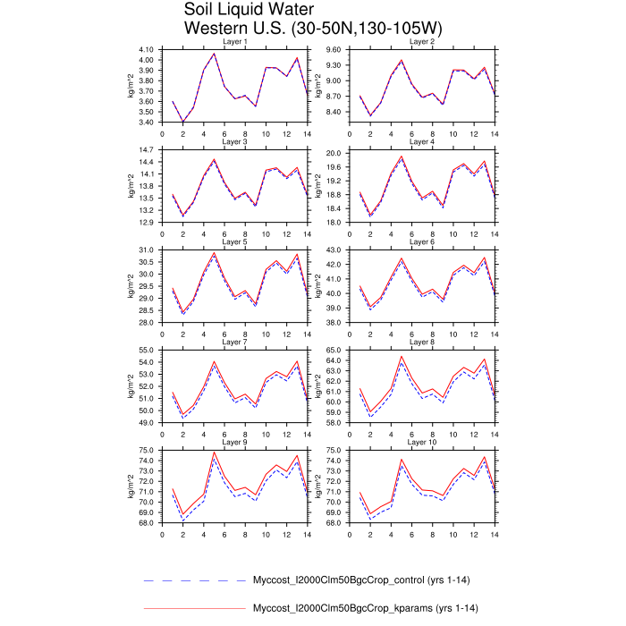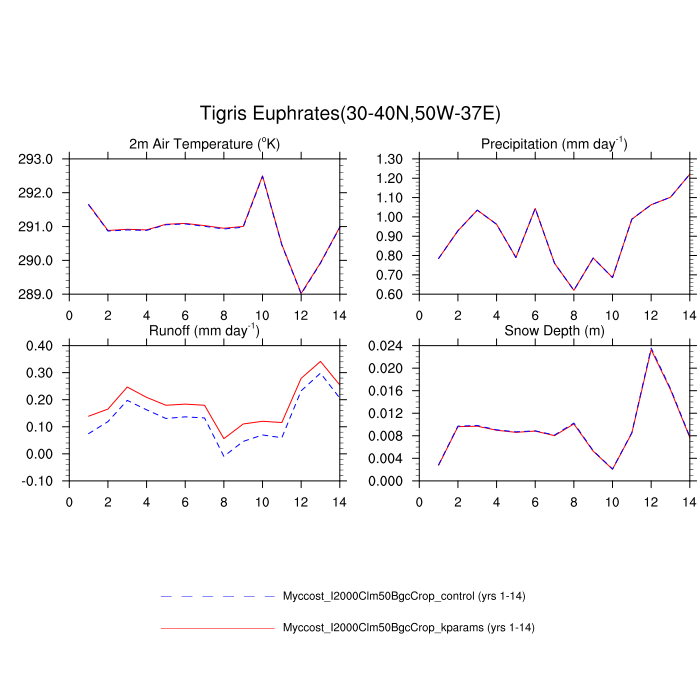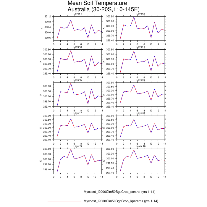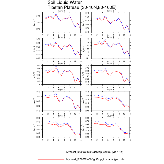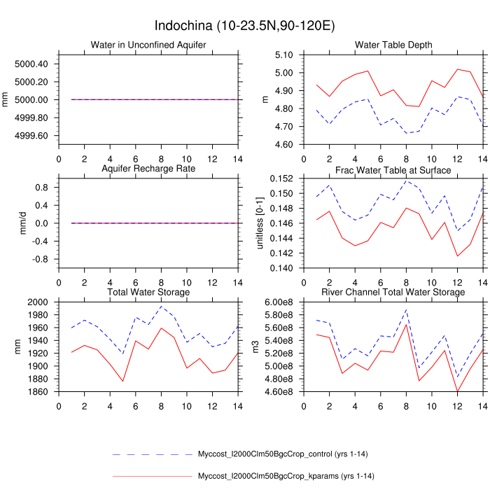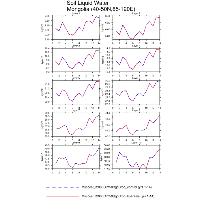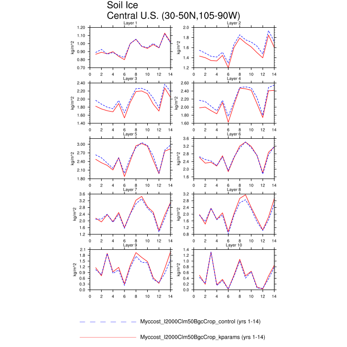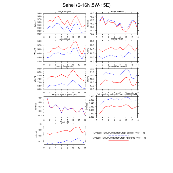 Set 6 Description: Line plots of annual trends in regional soil water/ice and temperature, runoff, snow water/ice, photosynthesis