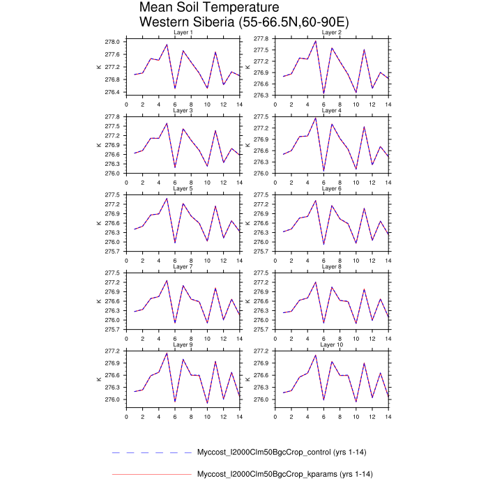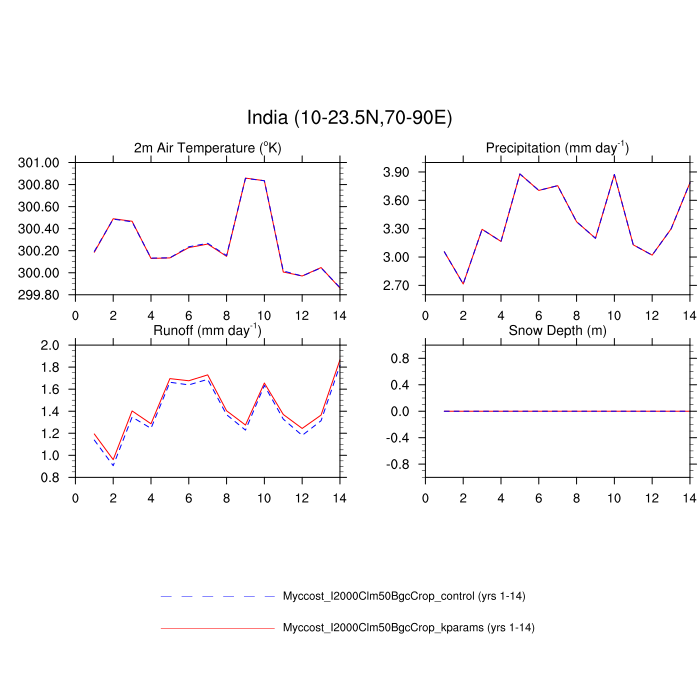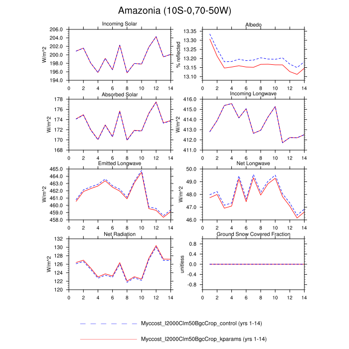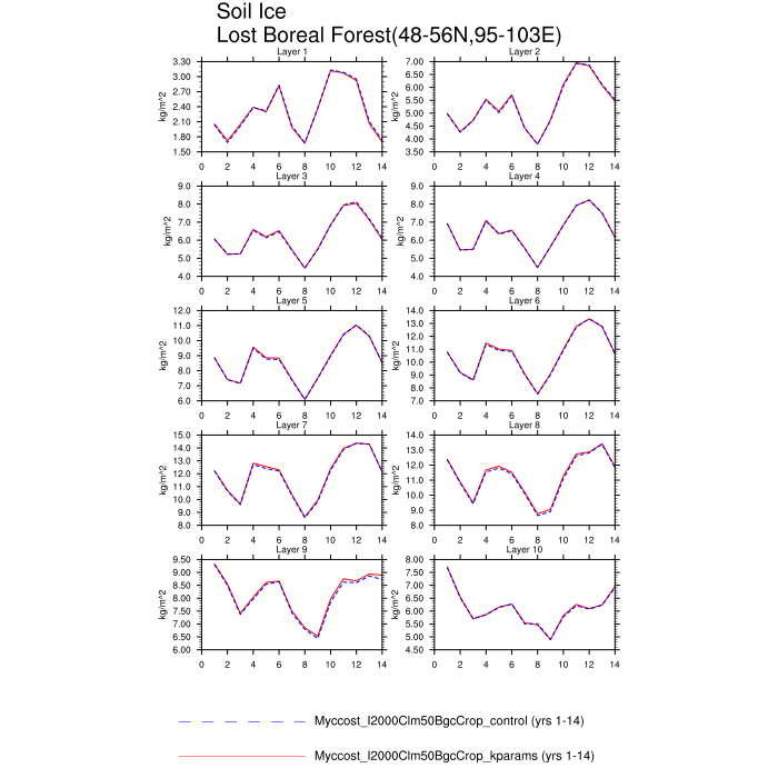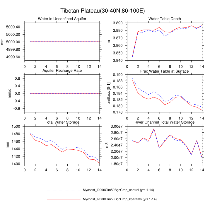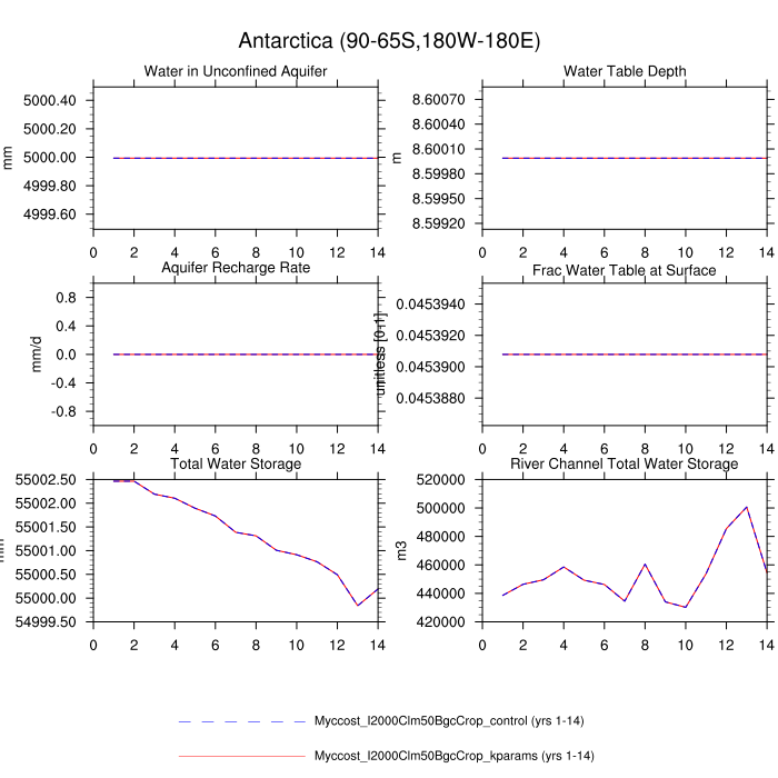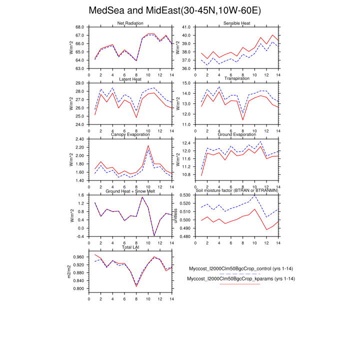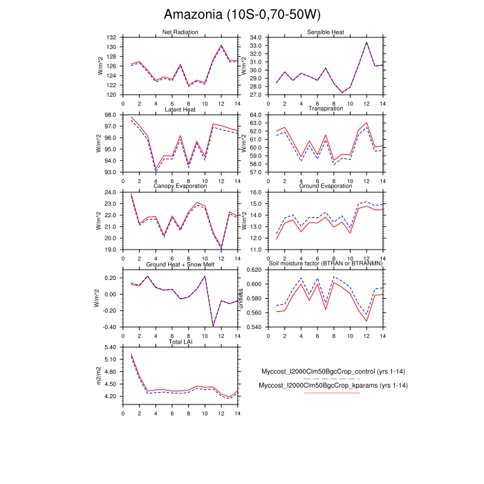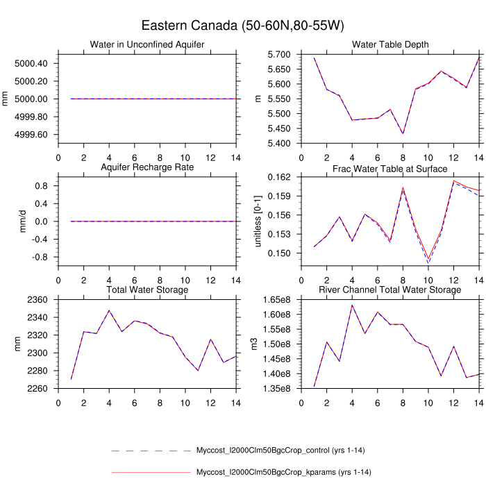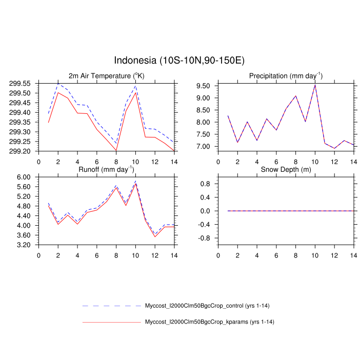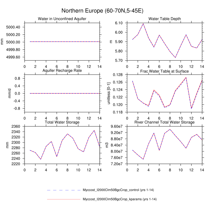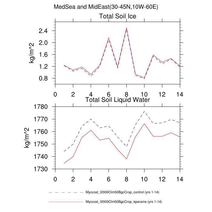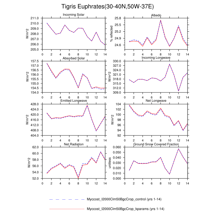 Set 6 Description: Line plots of annual trends in regional soil water/ice and temperature, runoff, snow water/ice, photosynthesis