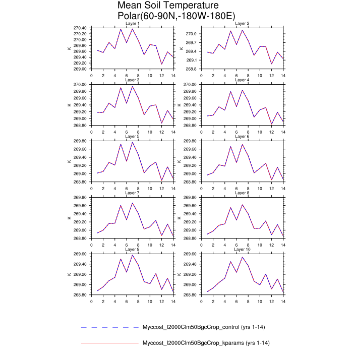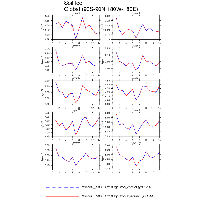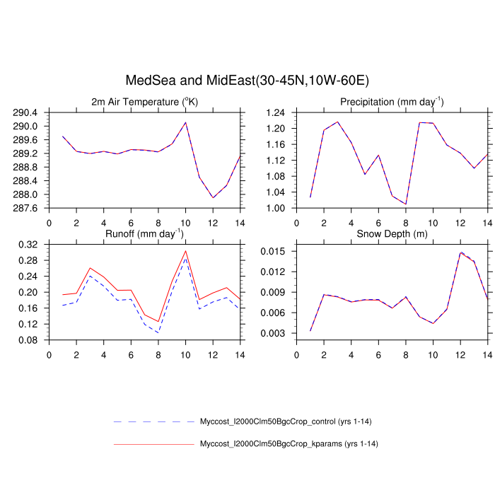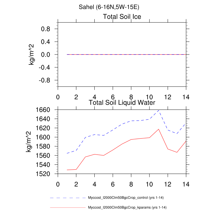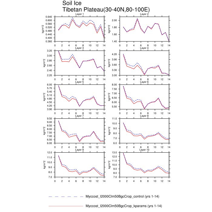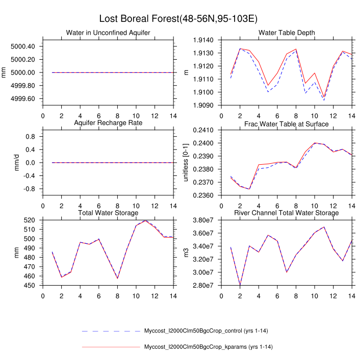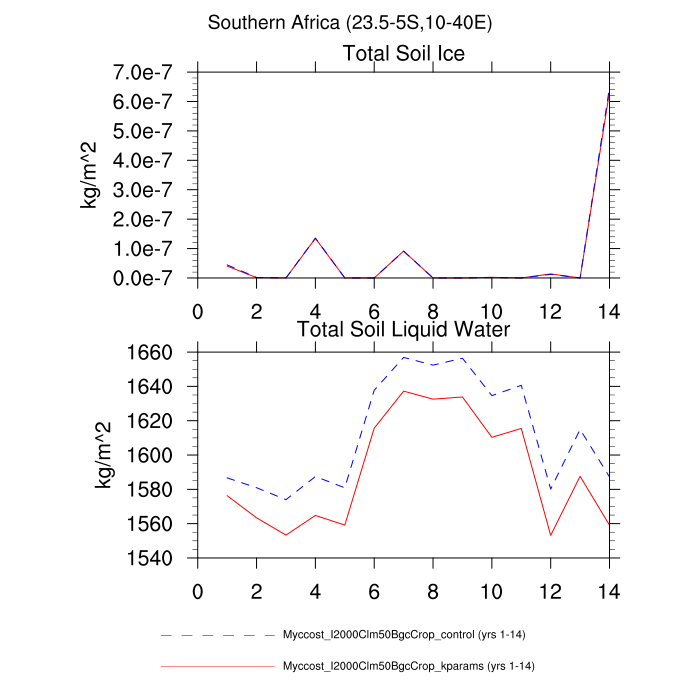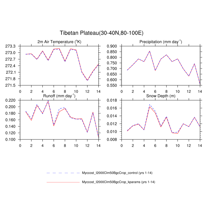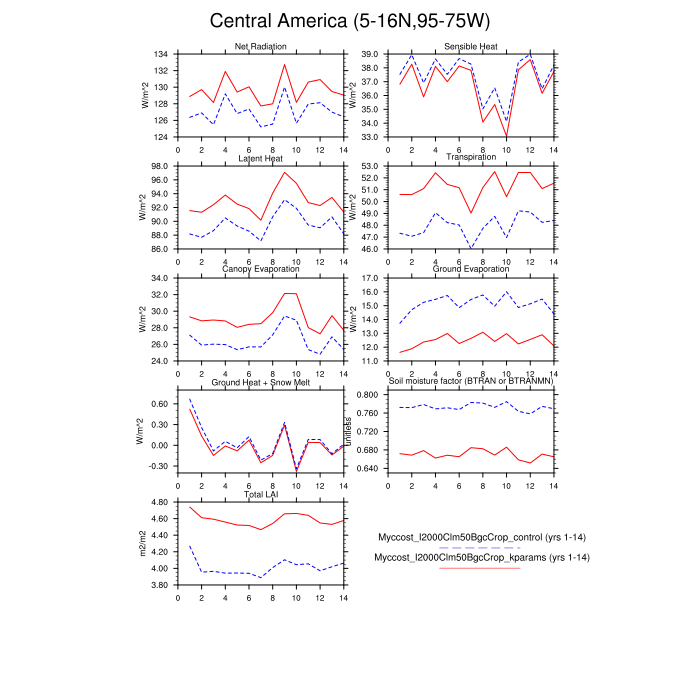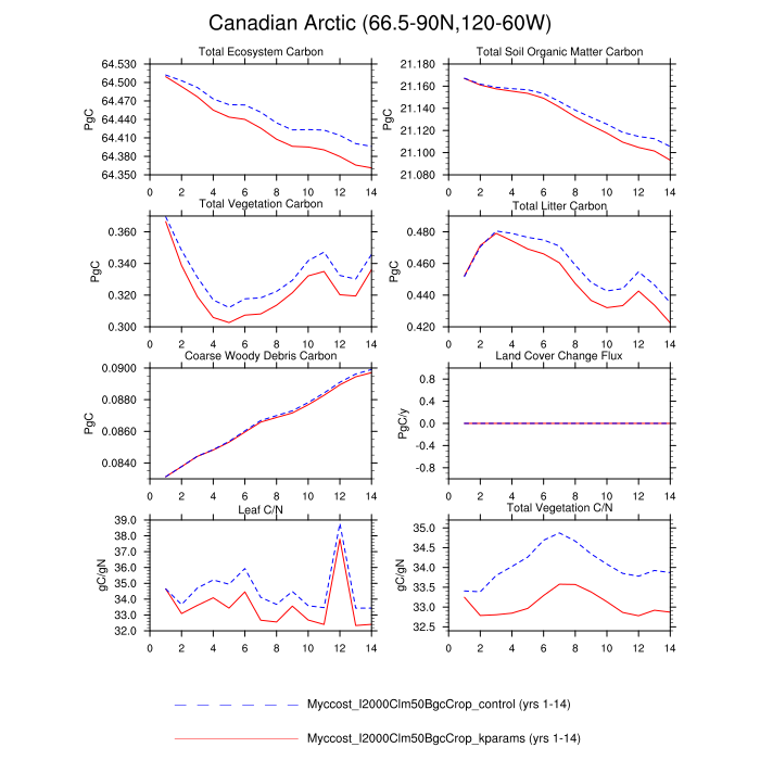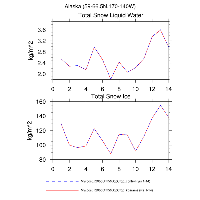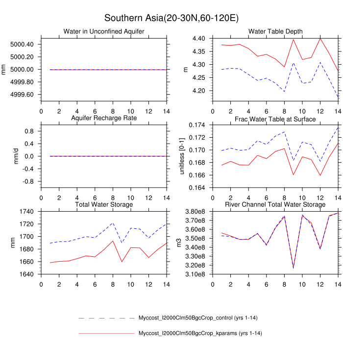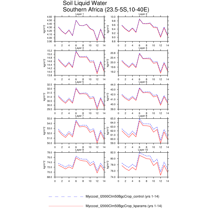Set 6 Description: Line plots of annual trends in regional soil water/ice and temperature, runoff, snow water/ice, photosynthesis