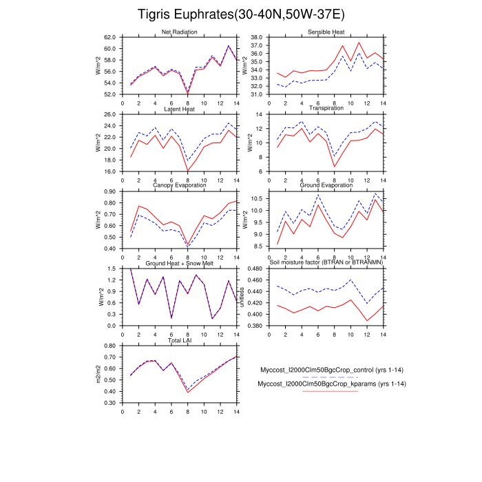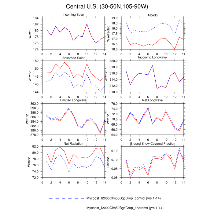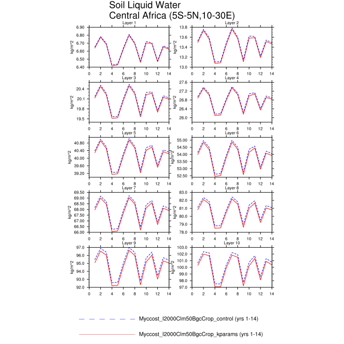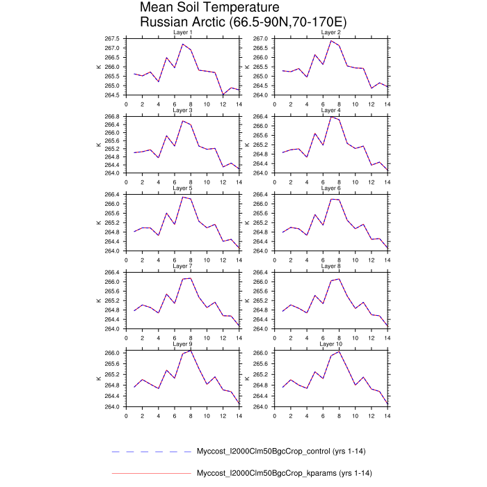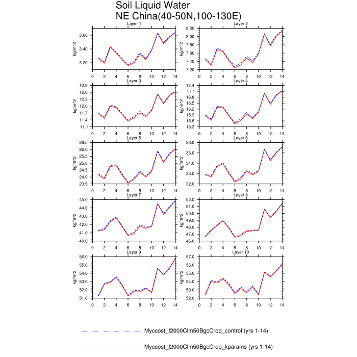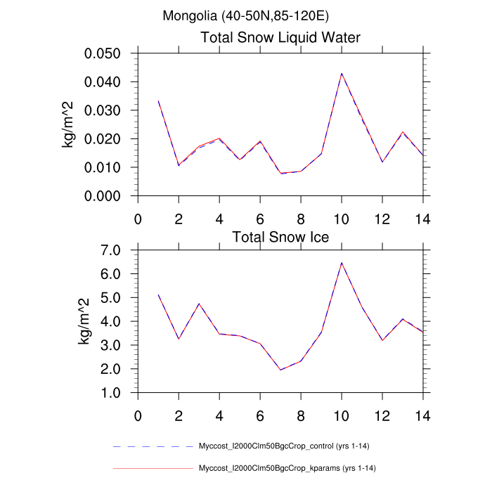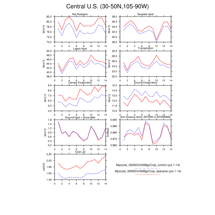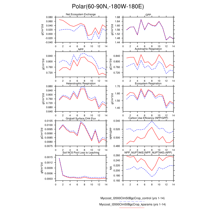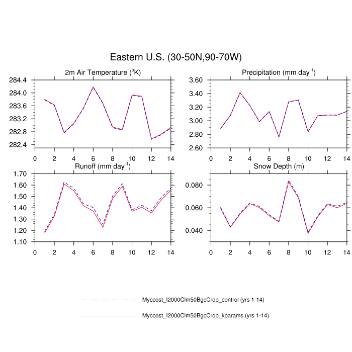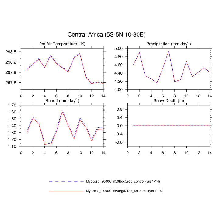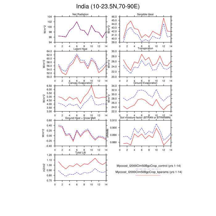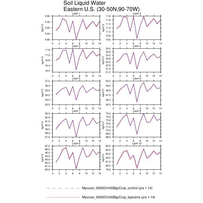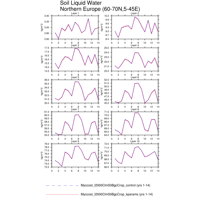 Set 6 Description: Line plots of annual trends in regional soil water/ice and temperature, runoff, snow water/ice, photosynthesis