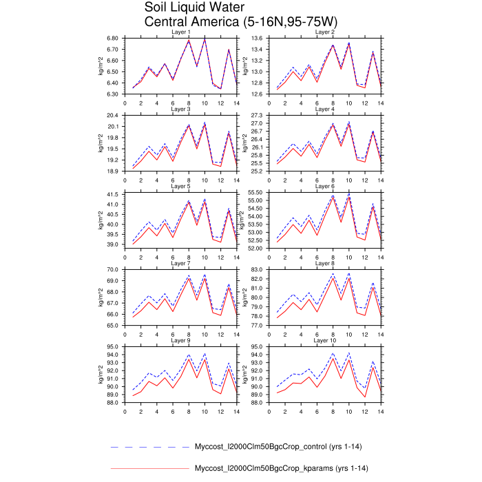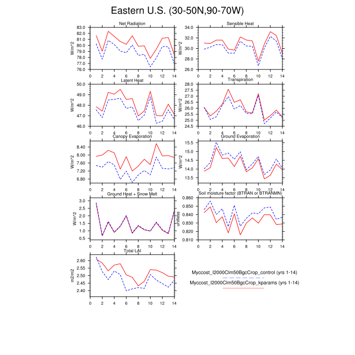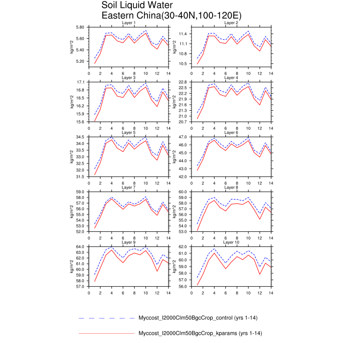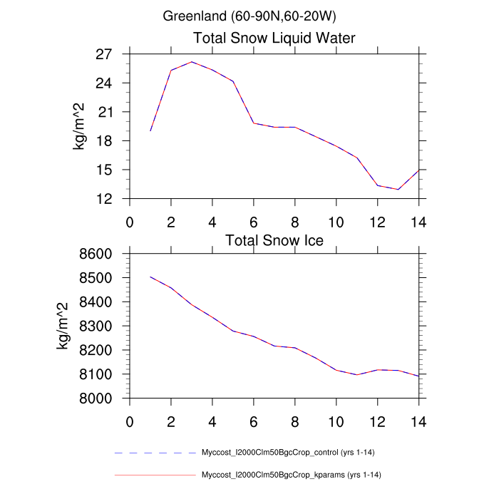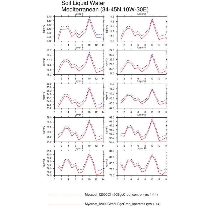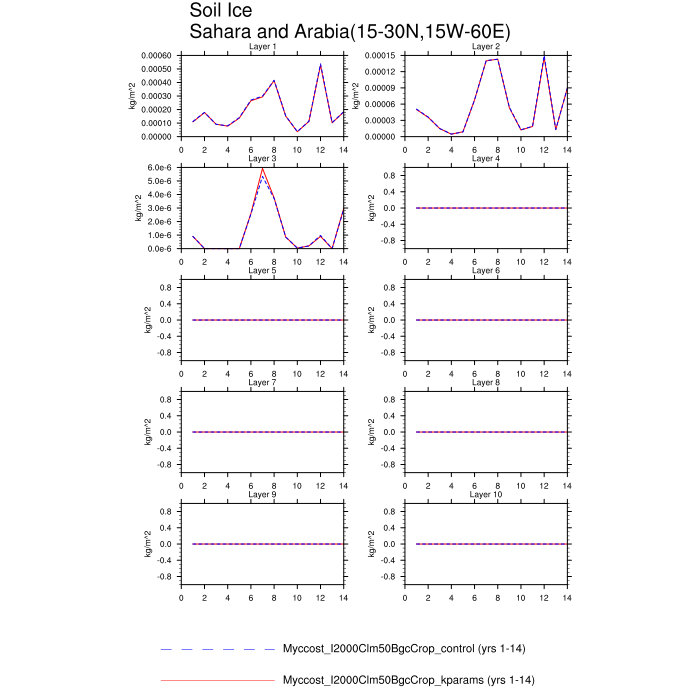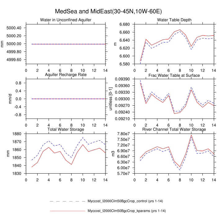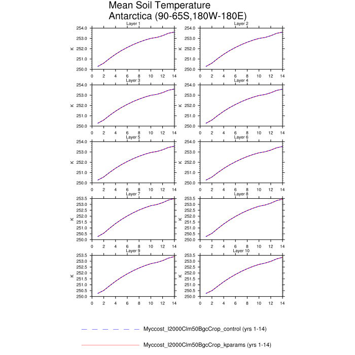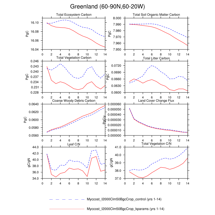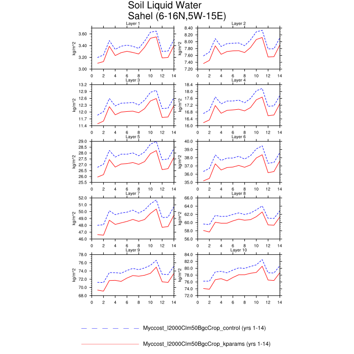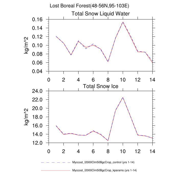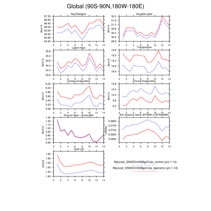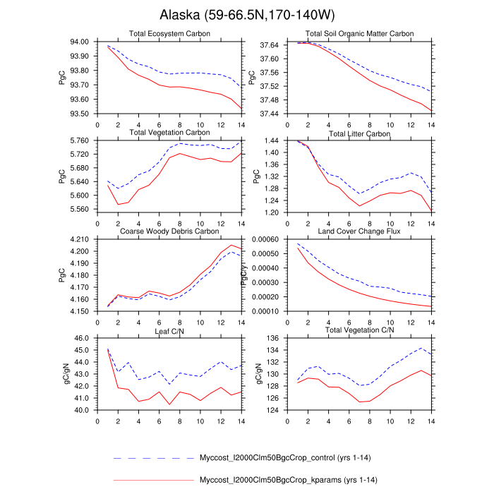 Set 6 Description: Line plots of annual trends in regional soil water/ice and temperature, runoff, snow water/ice, photosynthesis