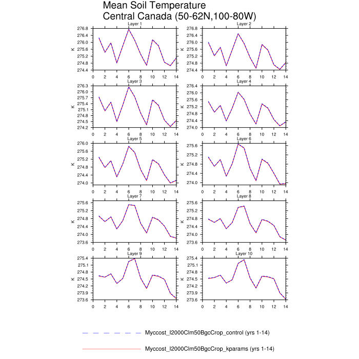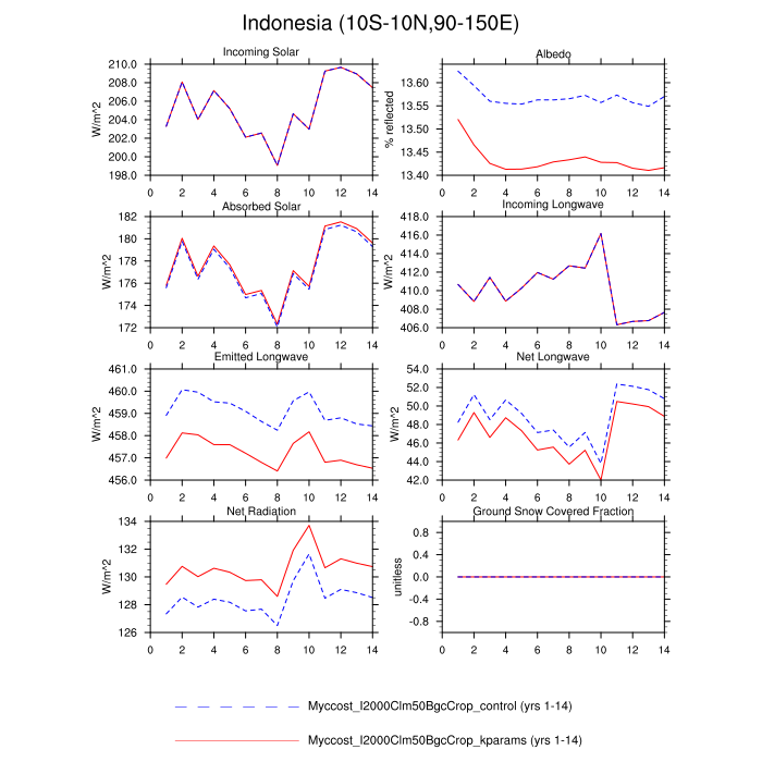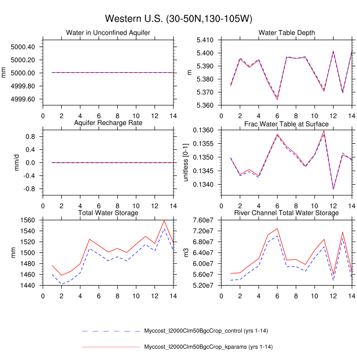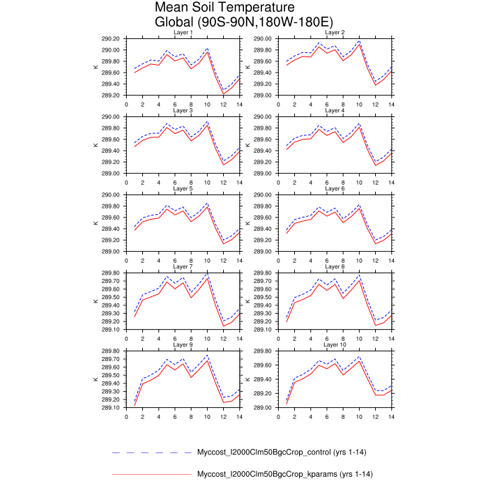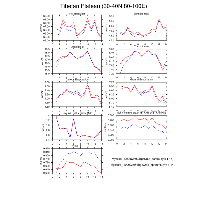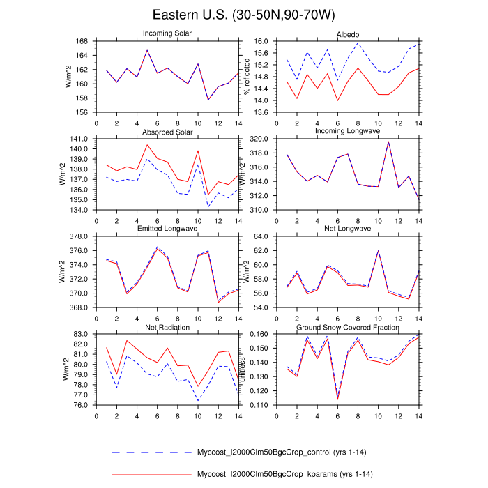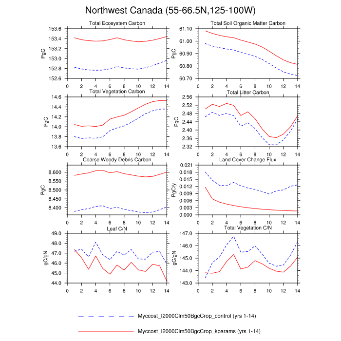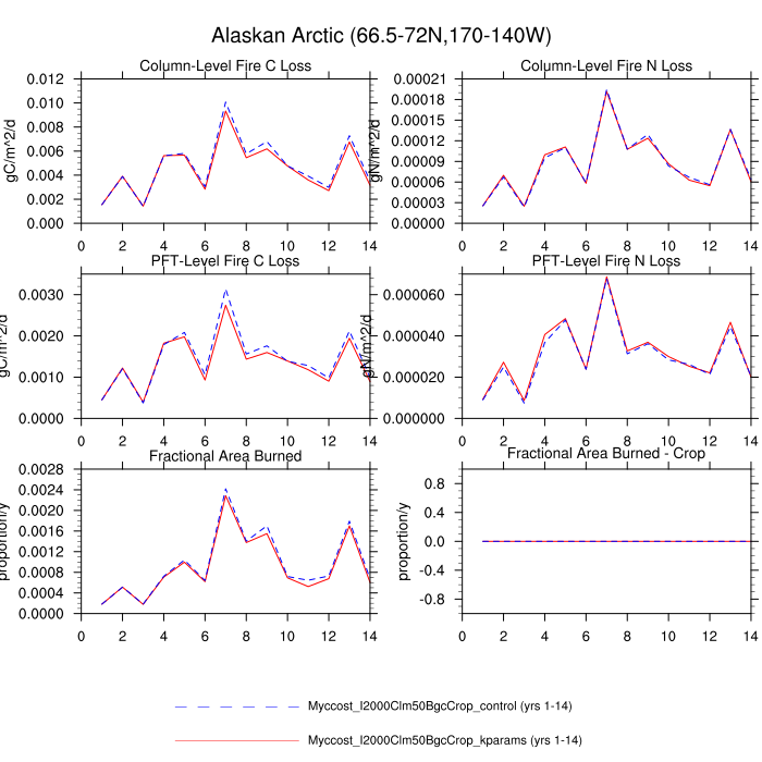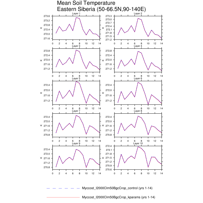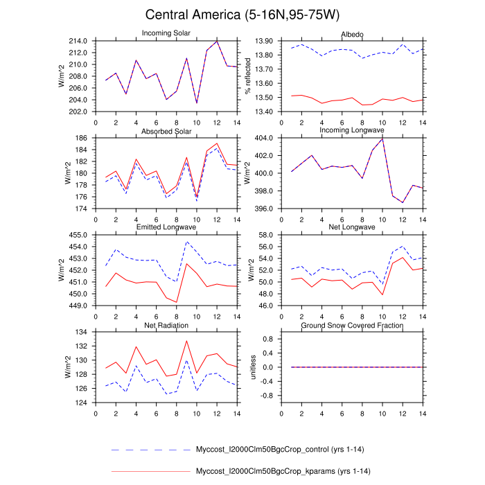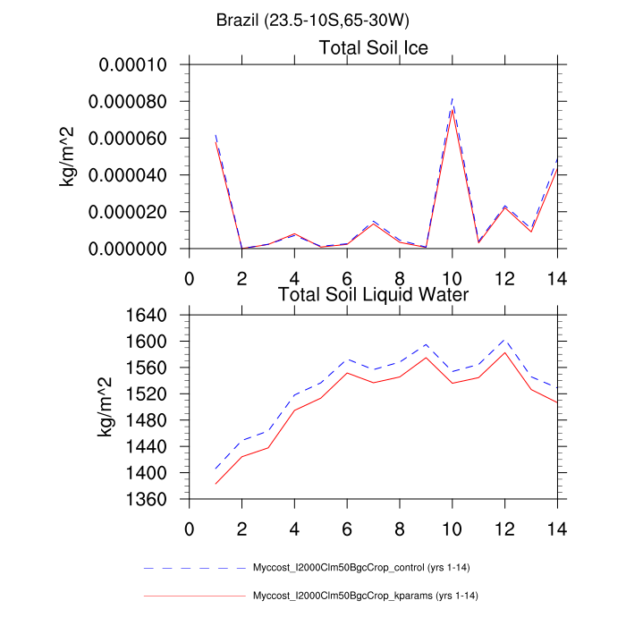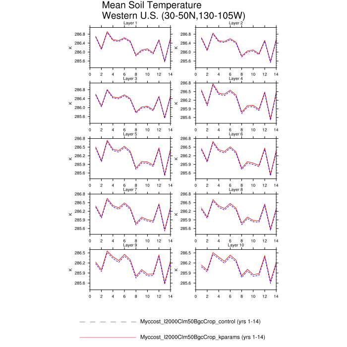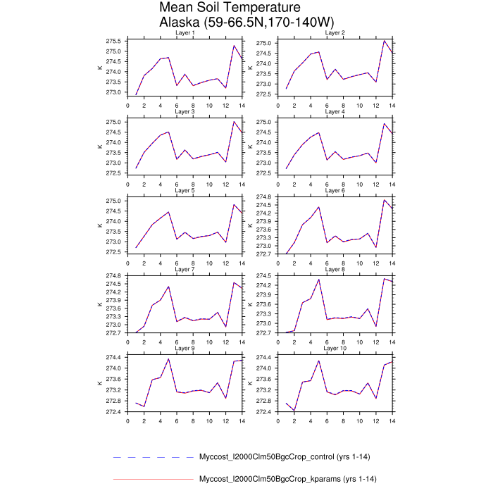 Set 6 Description: Line plots of annual trends in regional soil water/ice and temperature, runoff, snow water/ice, photosynthesis