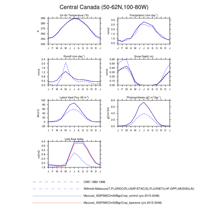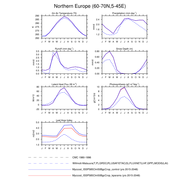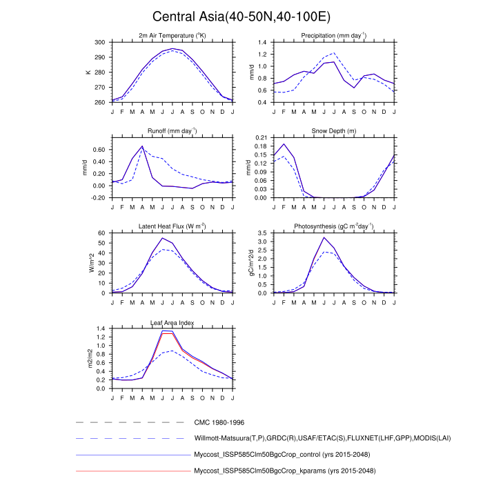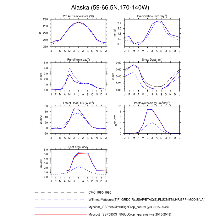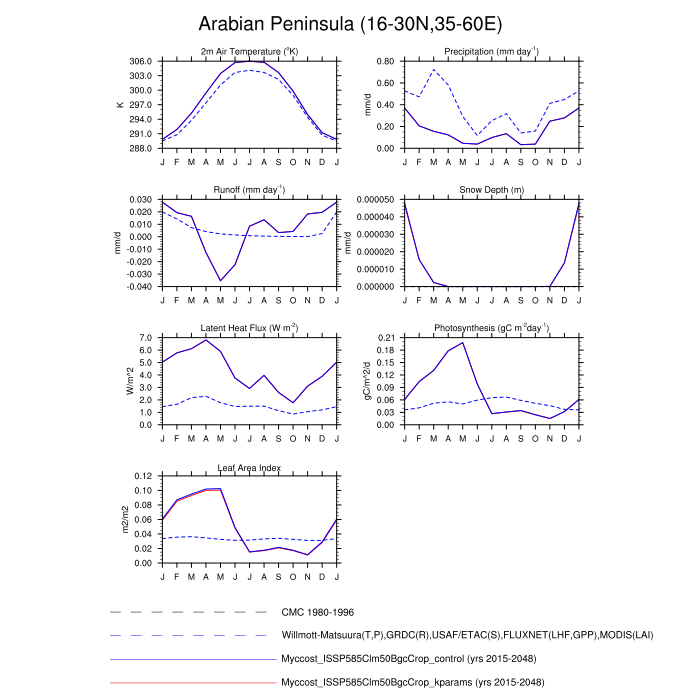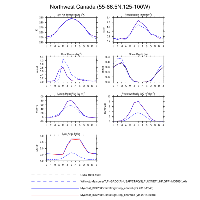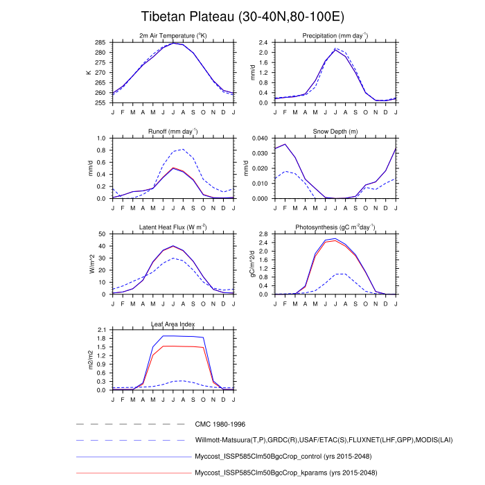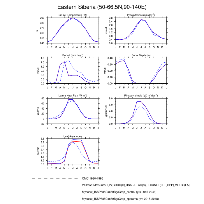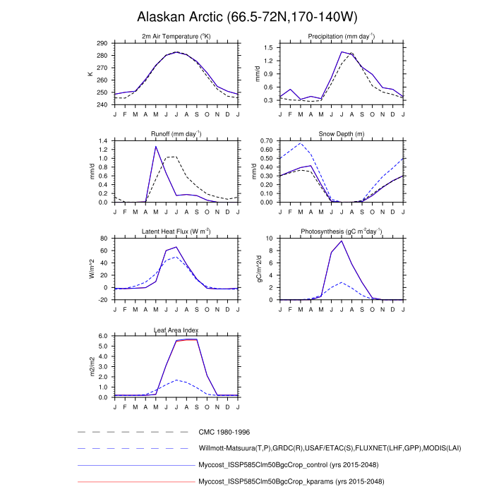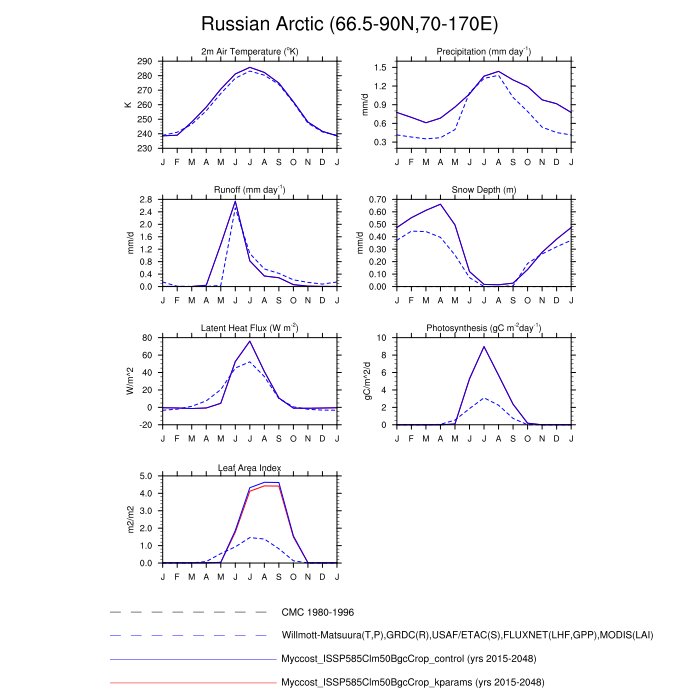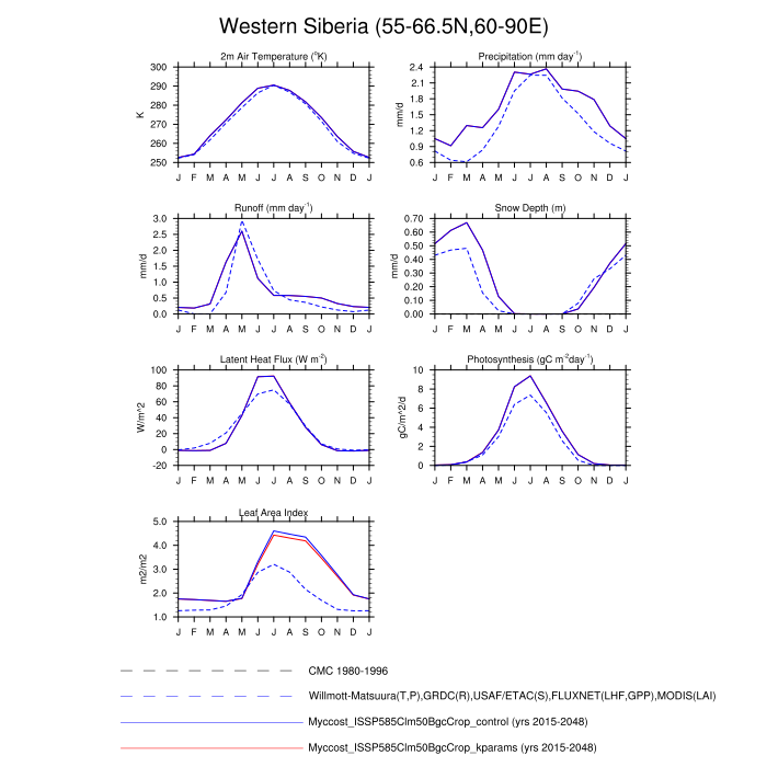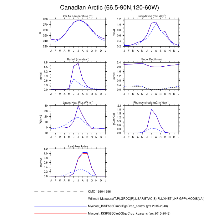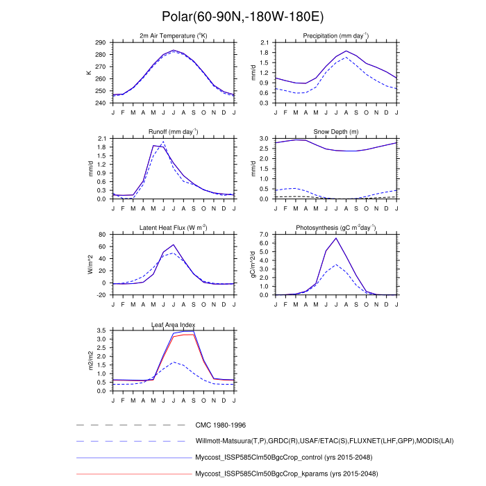 Set 3 Description: Line plots of monthly climatology: regional air temperature, precipitation, runoff, snow depth, radiative fluxes, and turbulent fluxes