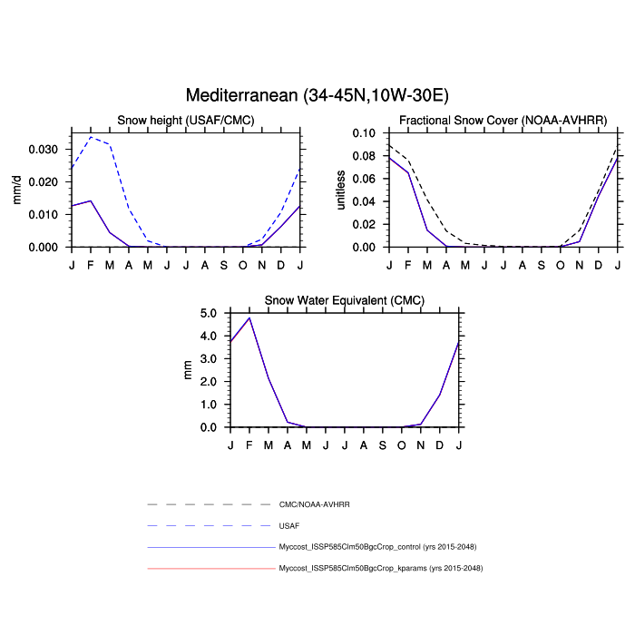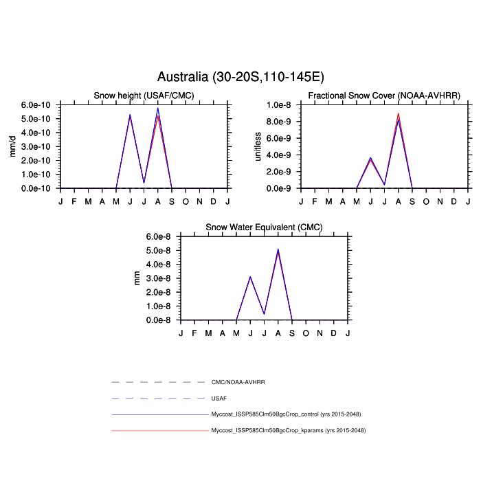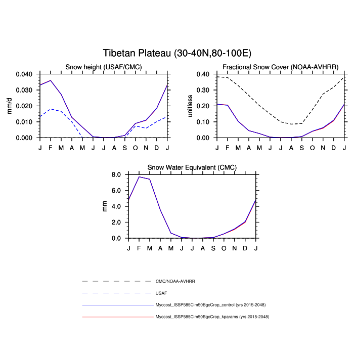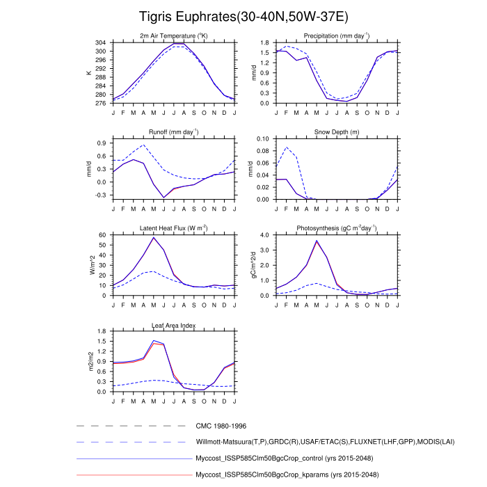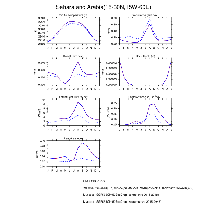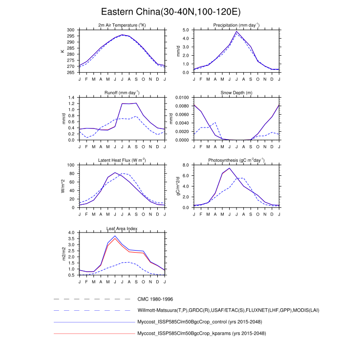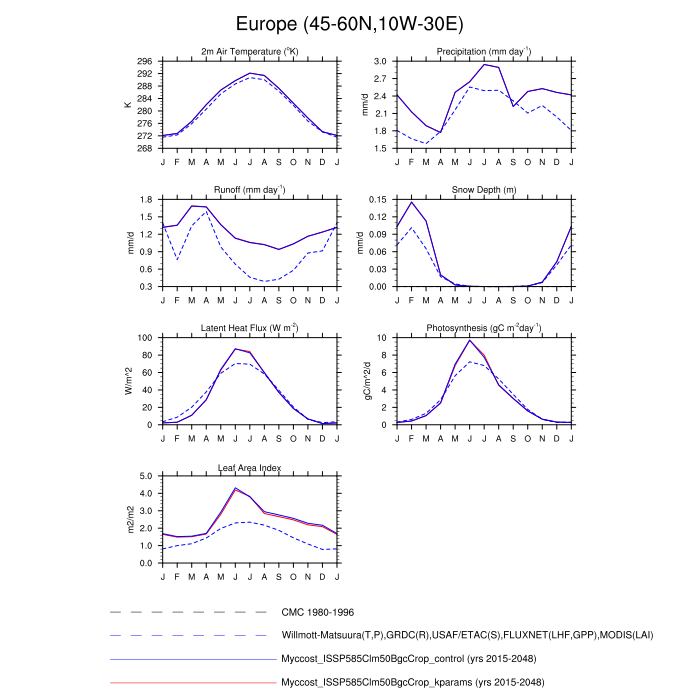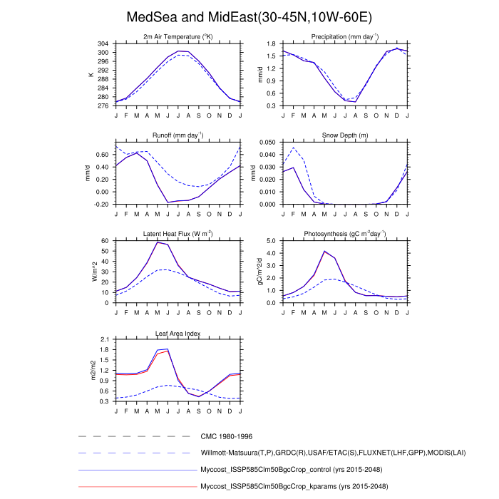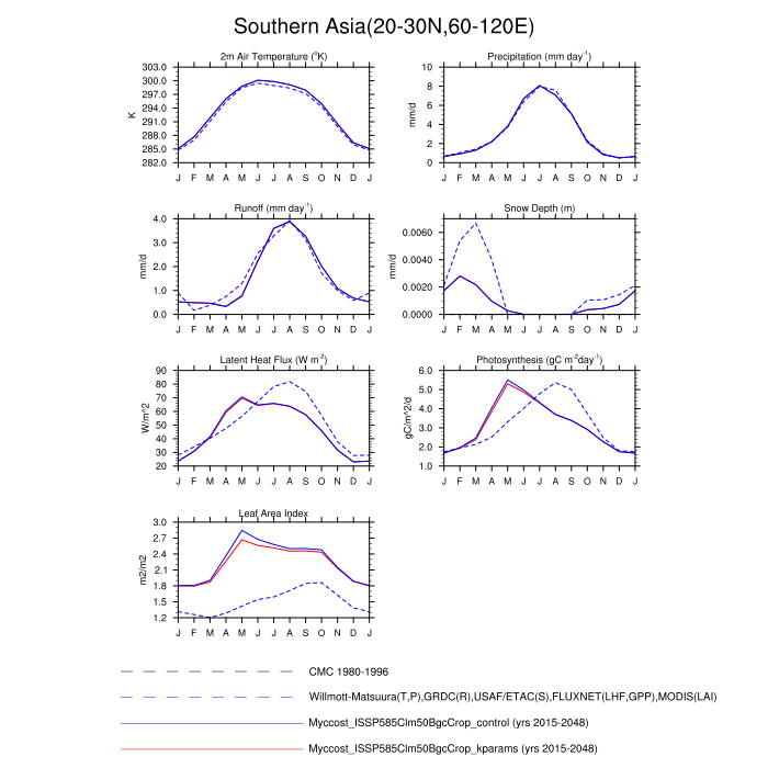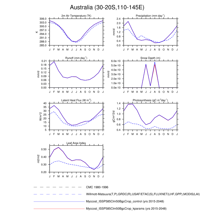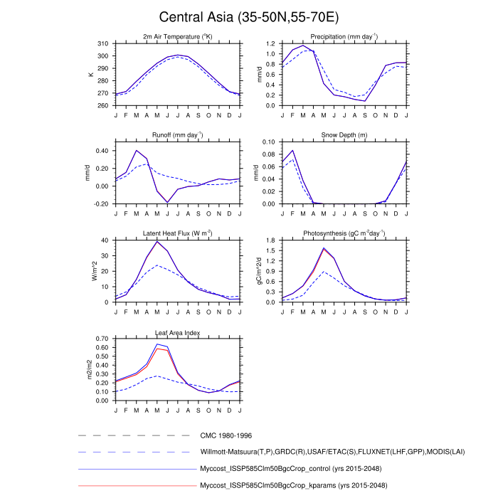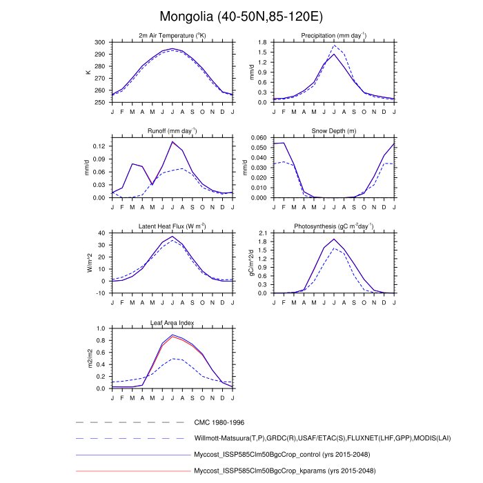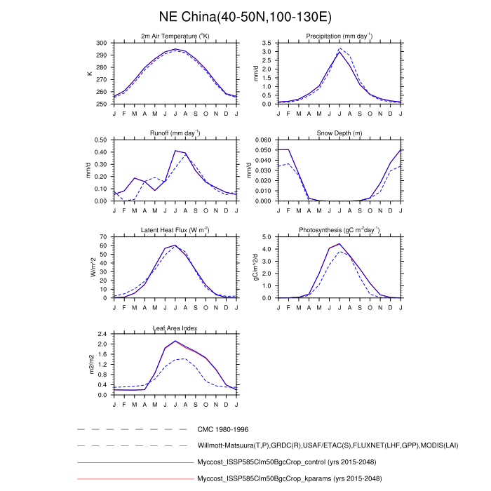 Set 3 Description: Line plots of monthly climatology: regional air temperature, precipitation, runoff, snow depth, radiative fluxes, and turbulent fluxes