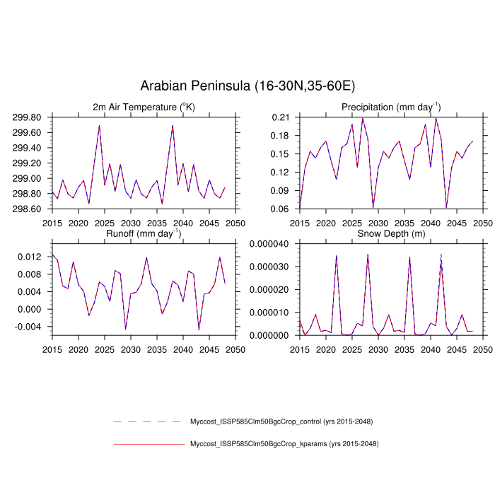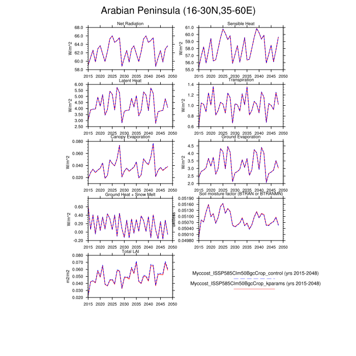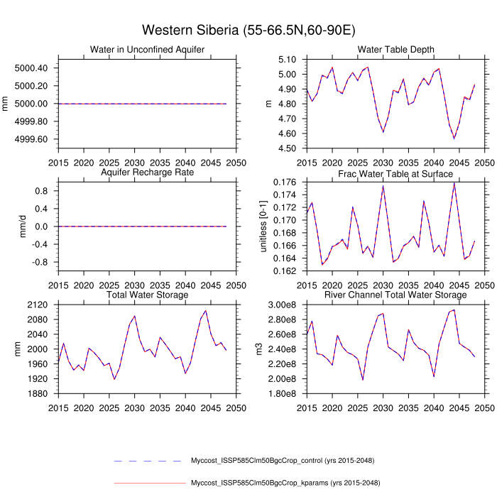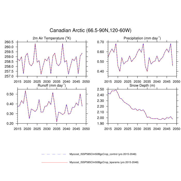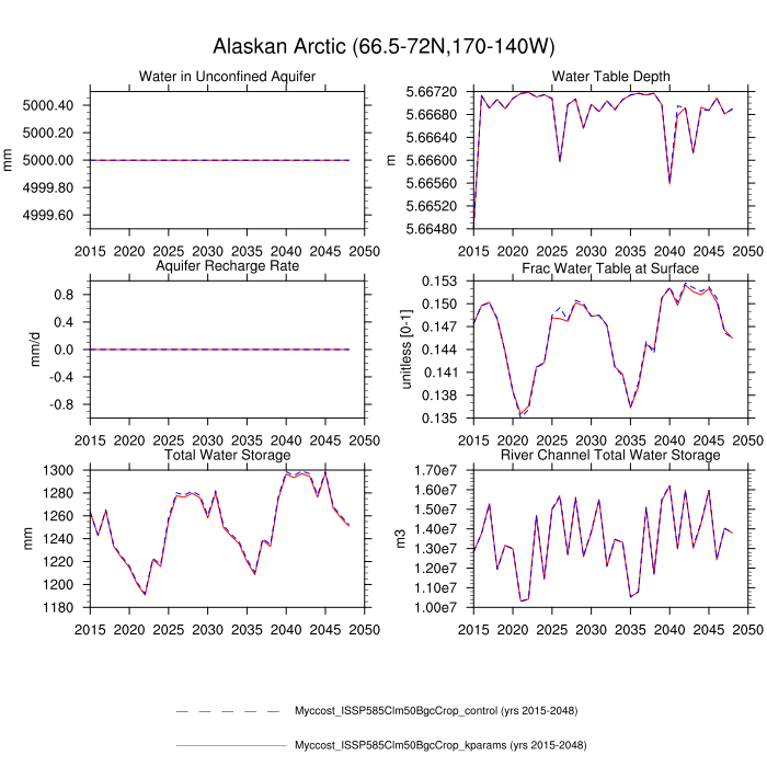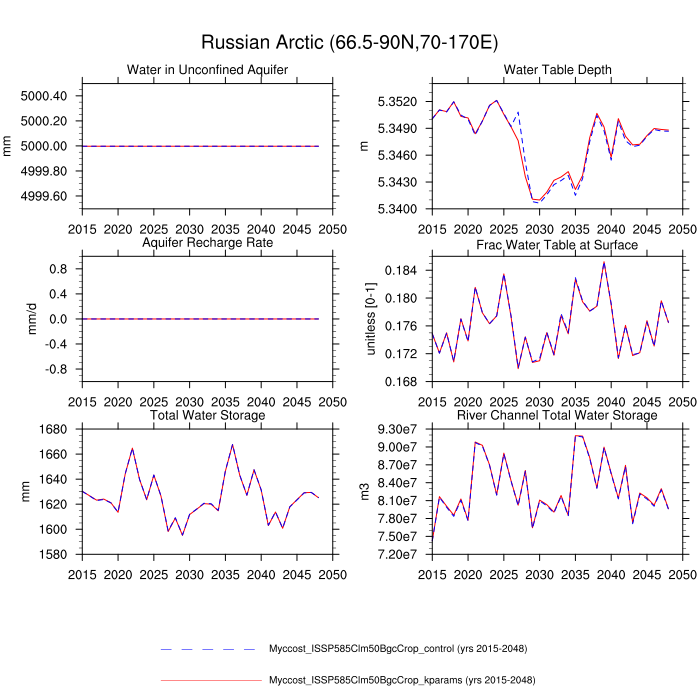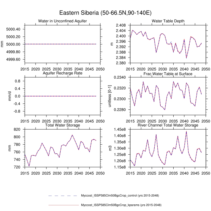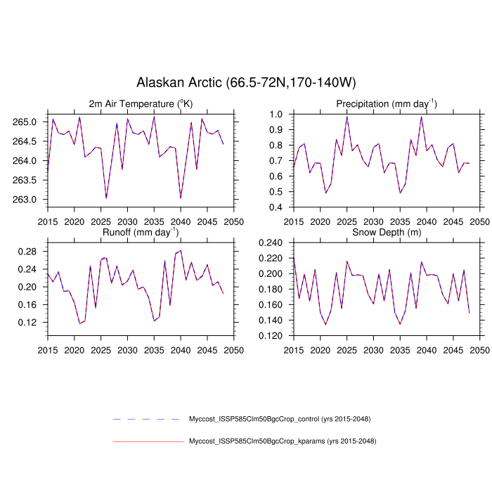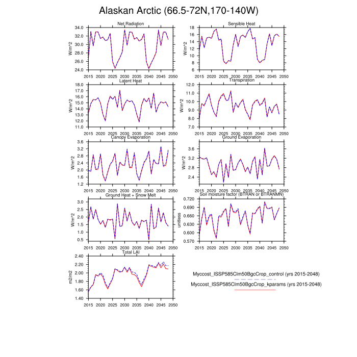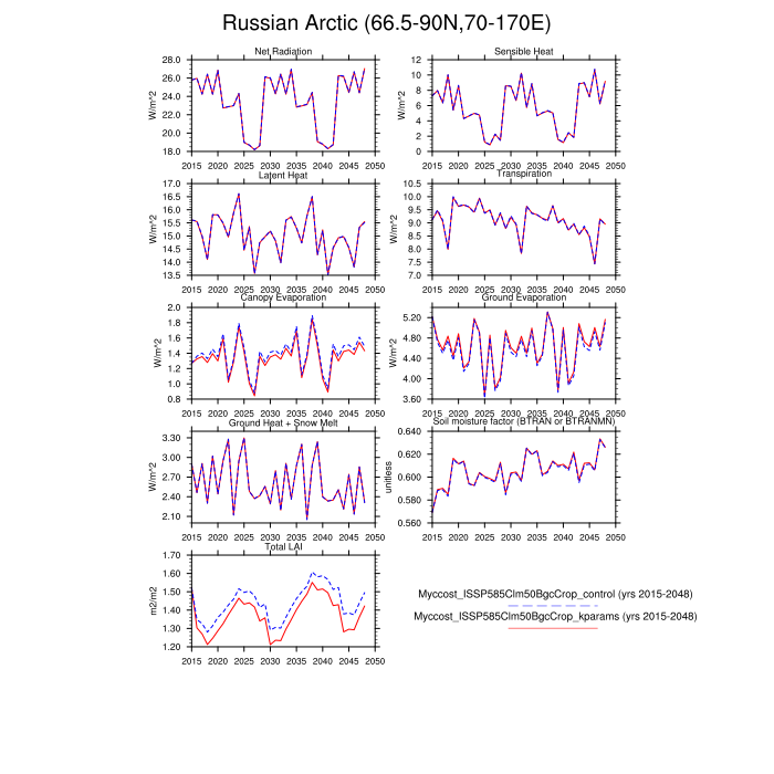Set 6 Description: Line plots of annual trends in regional soil water/ice and temperature, runoff, snow water/ice, photosynthesis